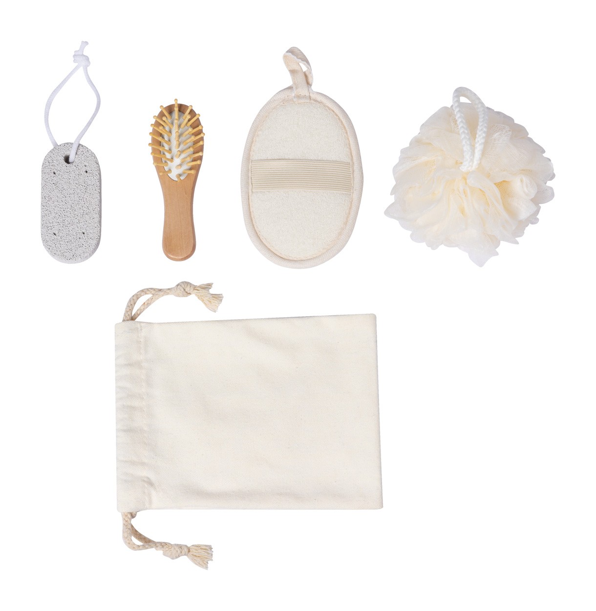 Set de baie din 4 buc, în husă de bumbac cu șnur. Include perie de păr din lemn, bureți moi și exfolianți și piatră ponce.