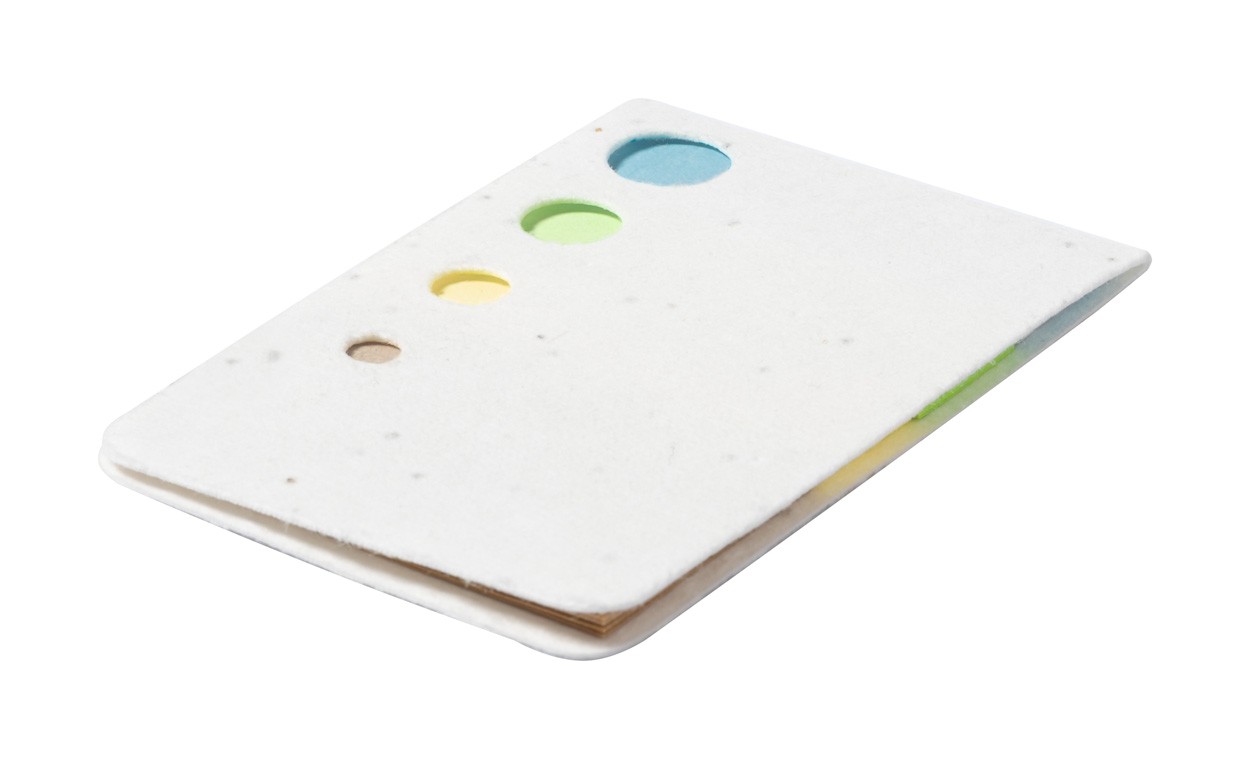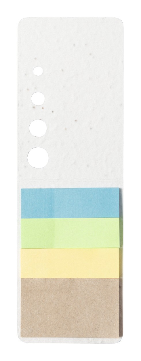 Bloc de note adezive, acoperit cu hârtie reciclată, cu 10 note și 30 de marcatoare de pagină (în 3 culori diferite). Coperta din hârtie cu semințe conține semințe de petunia în culori asortate, care pot fi plantate prin separarea capacului de blocnotes.