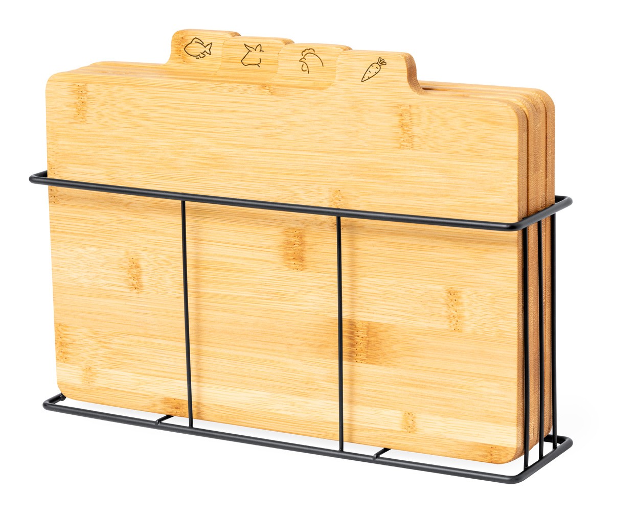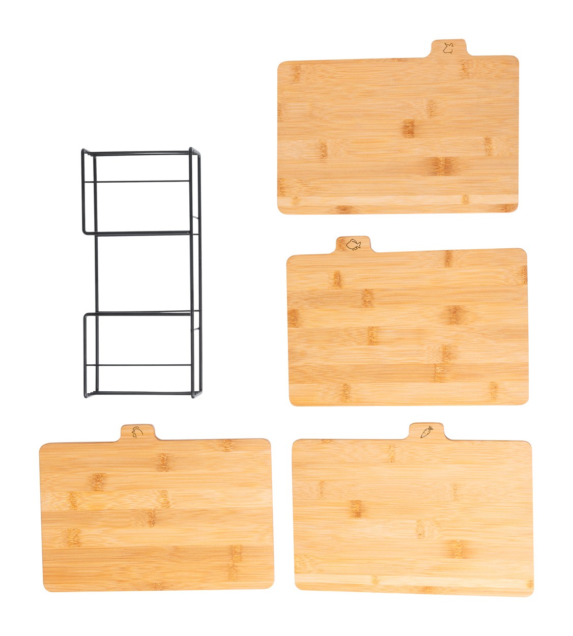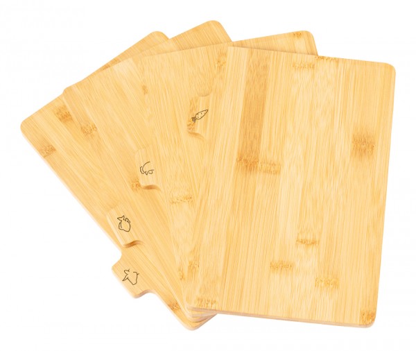Set de 4 bucăți tocătoare din bambus în suport metalic.