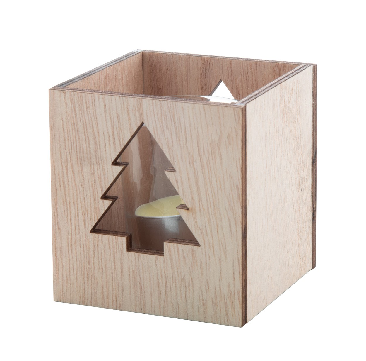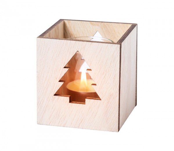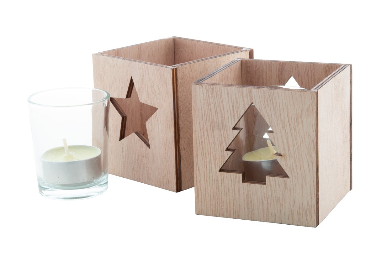 Lumânare parfumată cu vanilie în borcan de sticlă și suport pentru lumânări din lemn cu decor de Crăciun decupat.