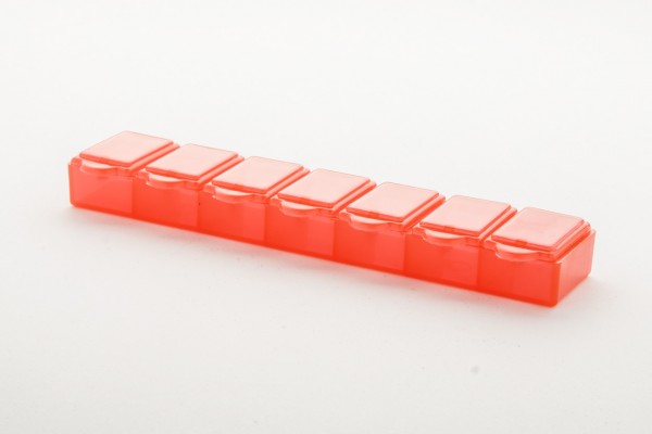 Cutie pentru medicamente, cu 7 compartimente. Din plastic.