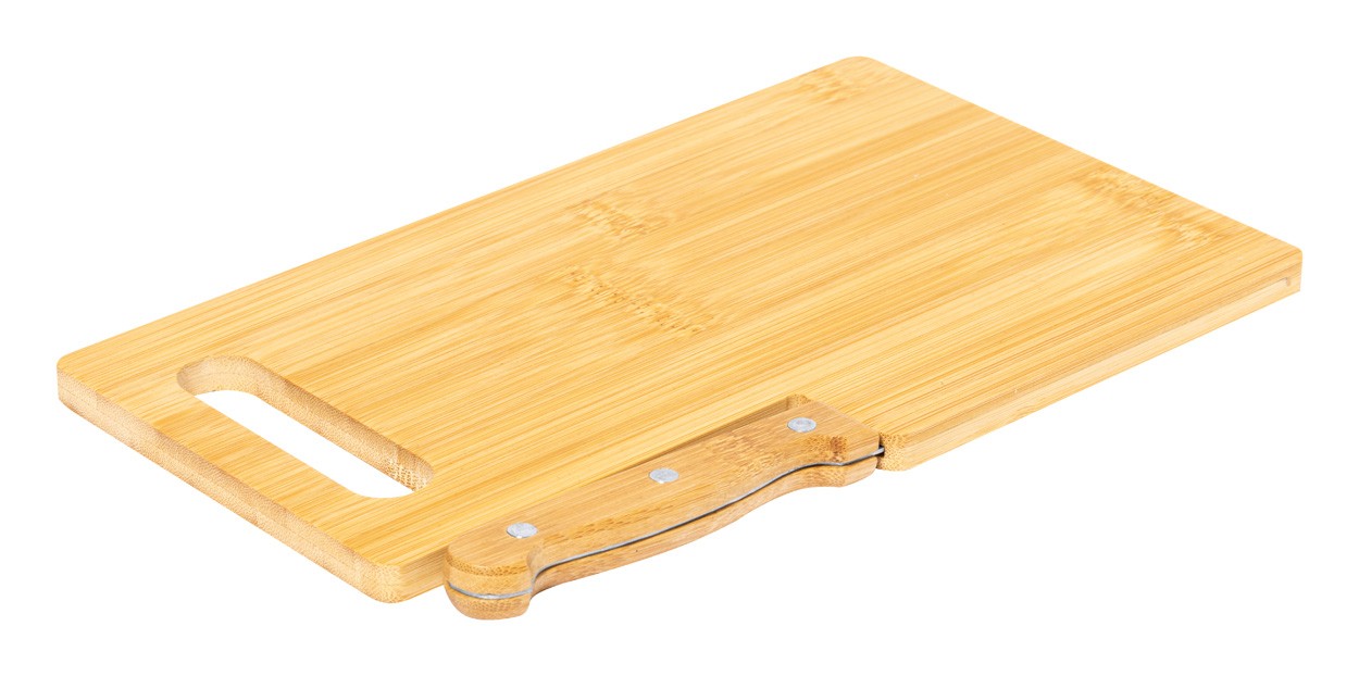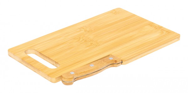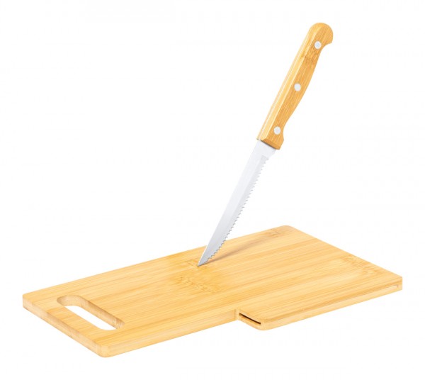 Bamboo cutting board with knife compartment and stainless steel knife with bamboo handle.