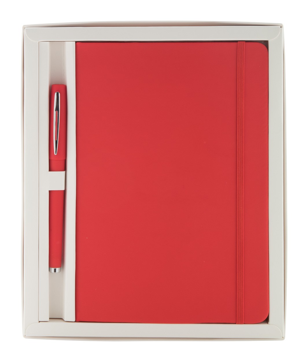 Setul conține un carnețel cu 100 file veline,cu copertă din înlocuitor piele și un pix din plastic de același culoare, mină albastră. În cutie albă de cadou.