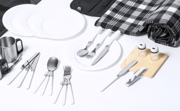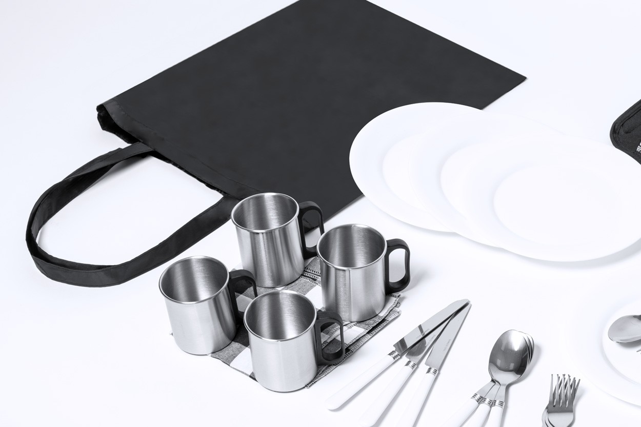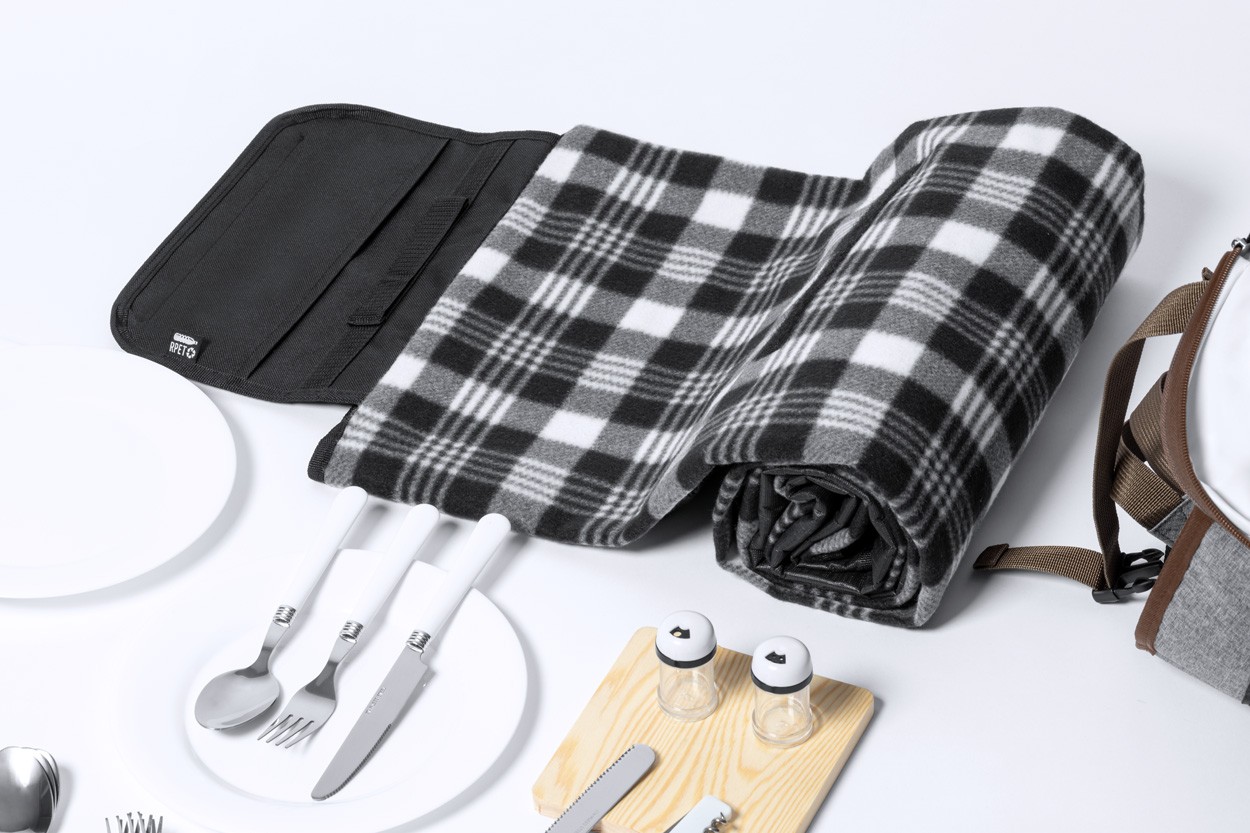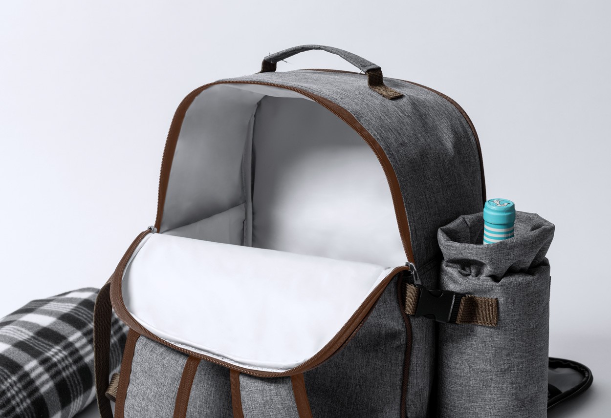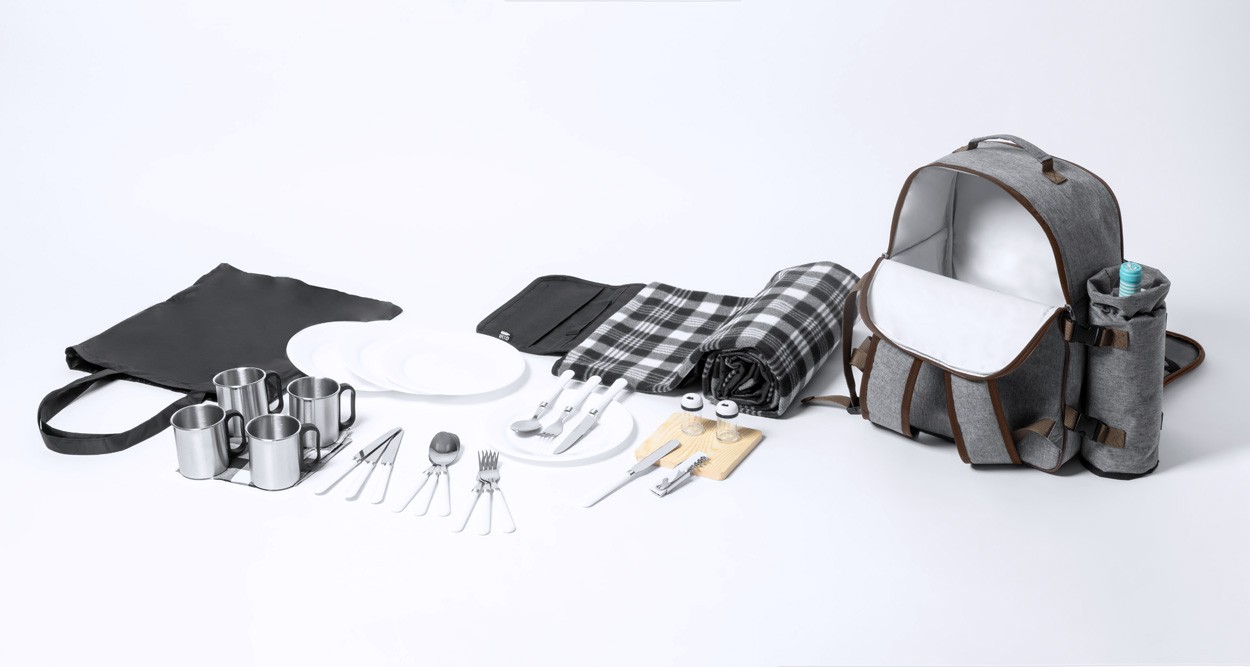 Rucsac frigorific, din poliester 600D RPET, cu căptușeală PEVA. Include set de veselă pentru 4 persoane și pătură de picnic din poliester 600D RPET (160 g/m2).