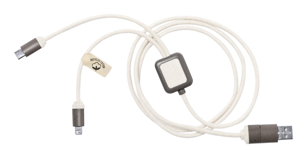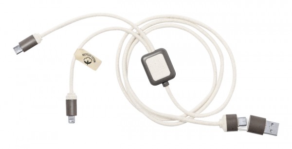 Cablu de încărcare USB, din plastic din fibră de cafea și bumbac reciclat. Cu conectori micro USB, USB-C și Lightning. Cu intrări USB și USB-C.