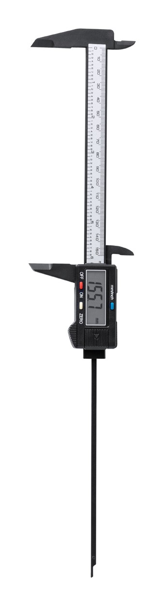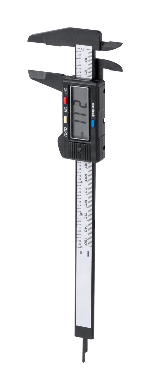 Caliper with digital and analog measuring modes and LCD display. Including button cell battery.