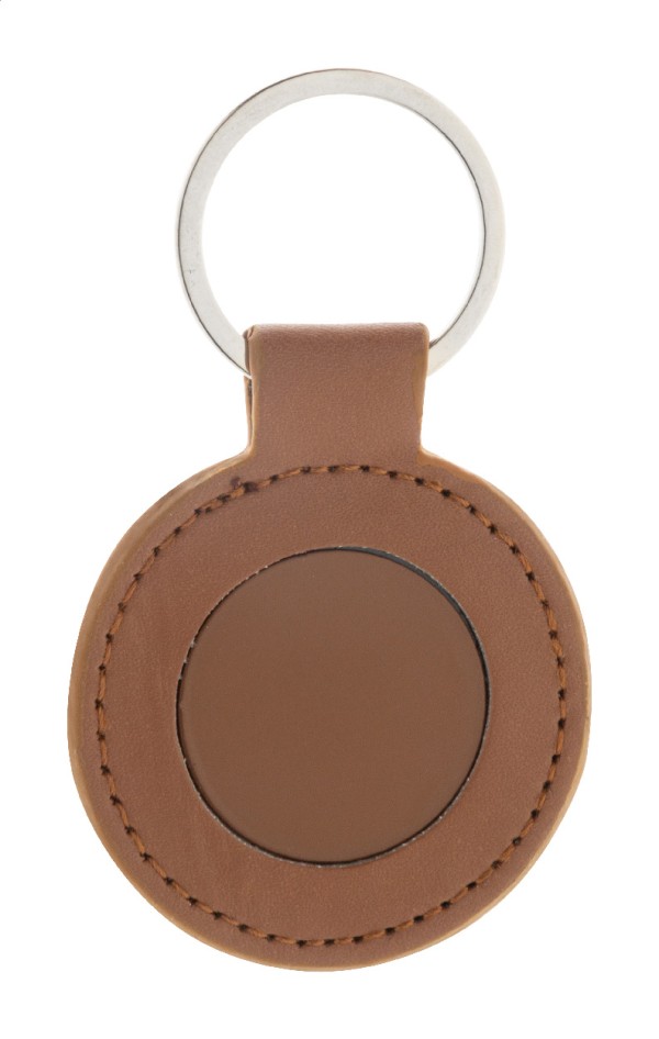 Breloc rotund, din piele PU reciclată, cu inel metalic și placă cu logo din oțel inoxidabil cu finisaj cauciucat. Cu acoperire specială pentru gravare cu laser în oglindă.