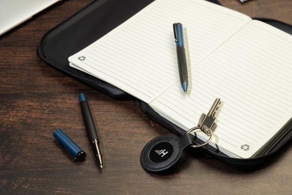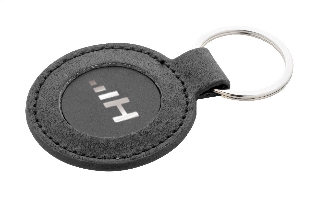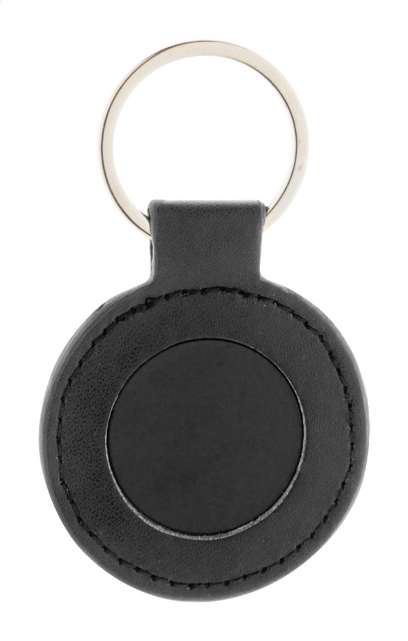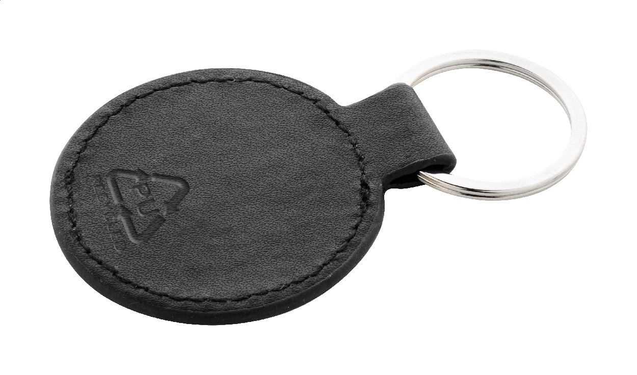 Breloc rotund, din piele PU reciclată, cu inel metalic și placă cu logo din oțel inoxidabil cu finisaj cauciucat. Cu acoperire specială pentru gravare cu laser în oglindă.