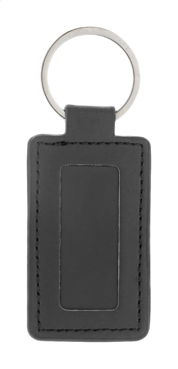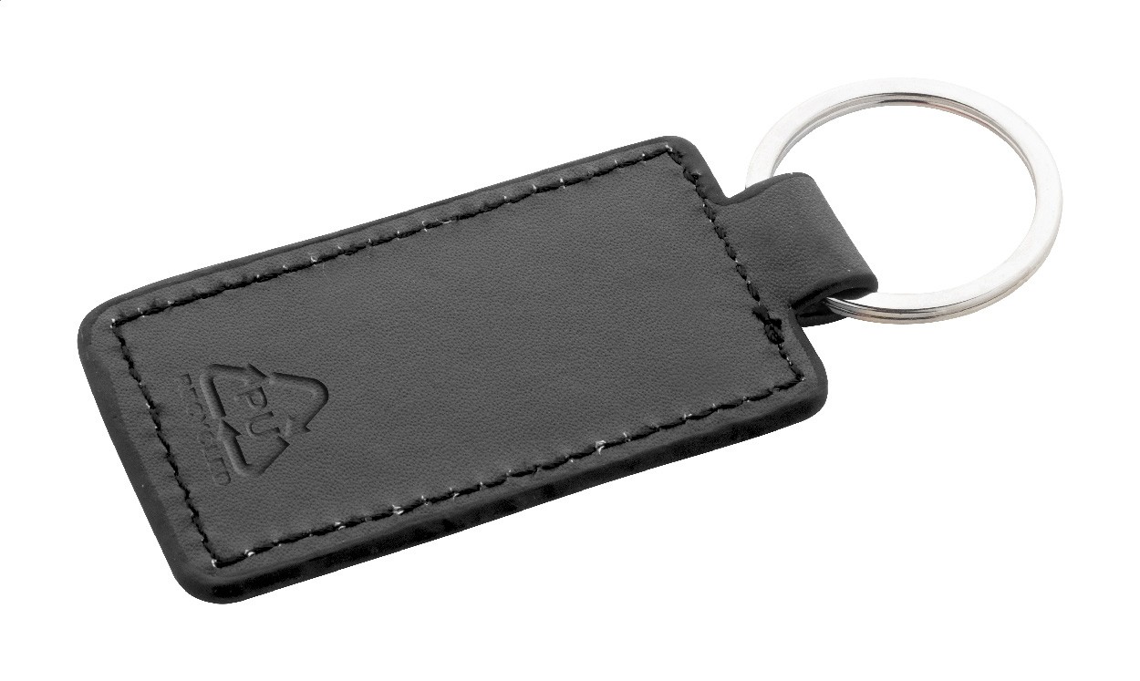 Breloc dreptunghiular, din piele PU reciclată, cu inel metalic și placă cu logo din oțel inoxidabil, cu finisaj cauciucat. Cu acoperire specială pentru gravare laser în oglindă.