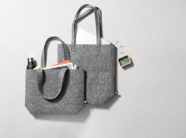 Sacoșă pentru cumpărături, din pâslă RPET, cu mânere extra lungi și garnitură inferioară. Cu etichetă distinctivă RPET.