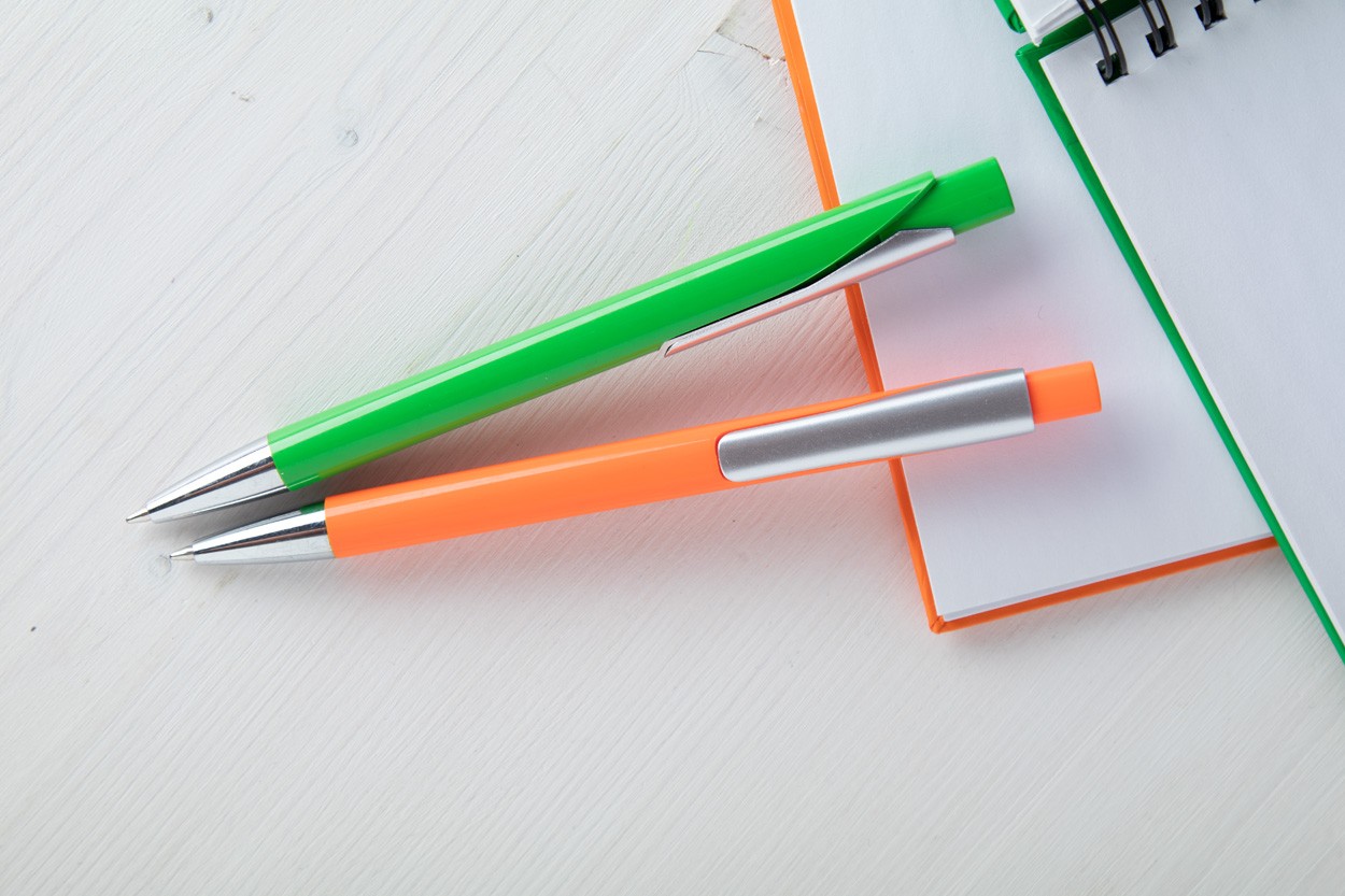 Pix colorat din plastic, cu clips argintiu și vârf cromat, mină albastră.