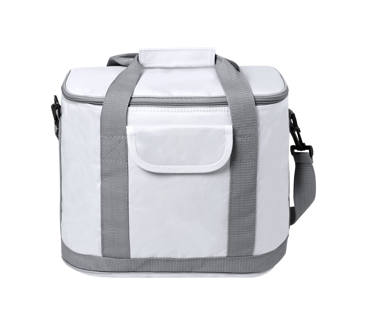 Geantă frigorifică cu fermoar, din poliester 420D, cu căptușeală PEVA. Cu velcro buzunar frontal, mânere de transport și curea de umăr ajustabilă.