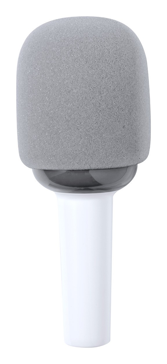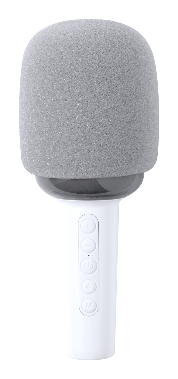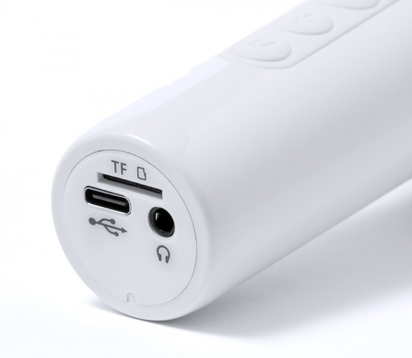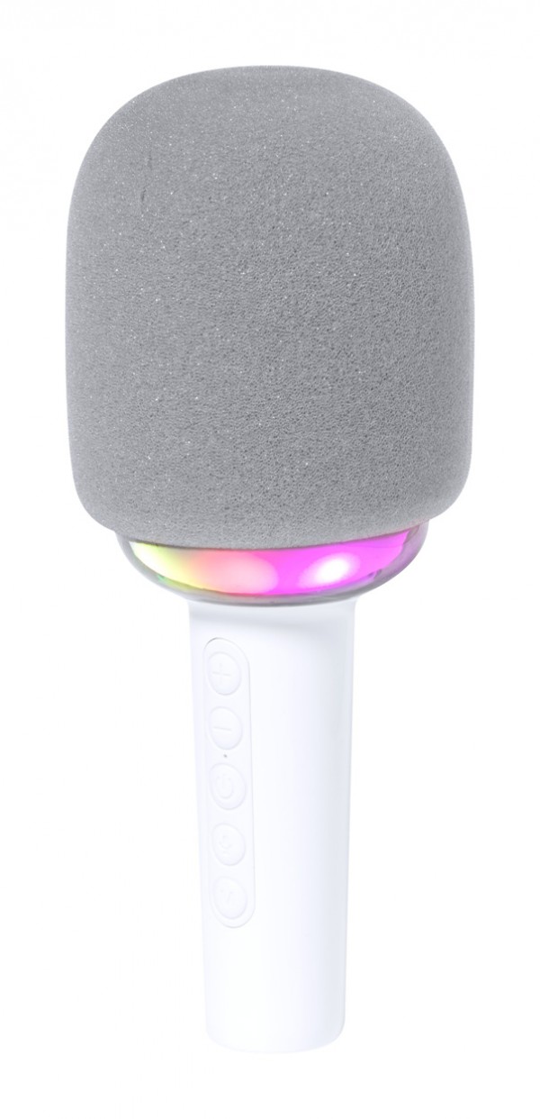 ABS plastic microphone and speaker with bluetooth connection, multicolour LED lights, micro SD player and built-in rechargeable battery. Including USB charger cable.