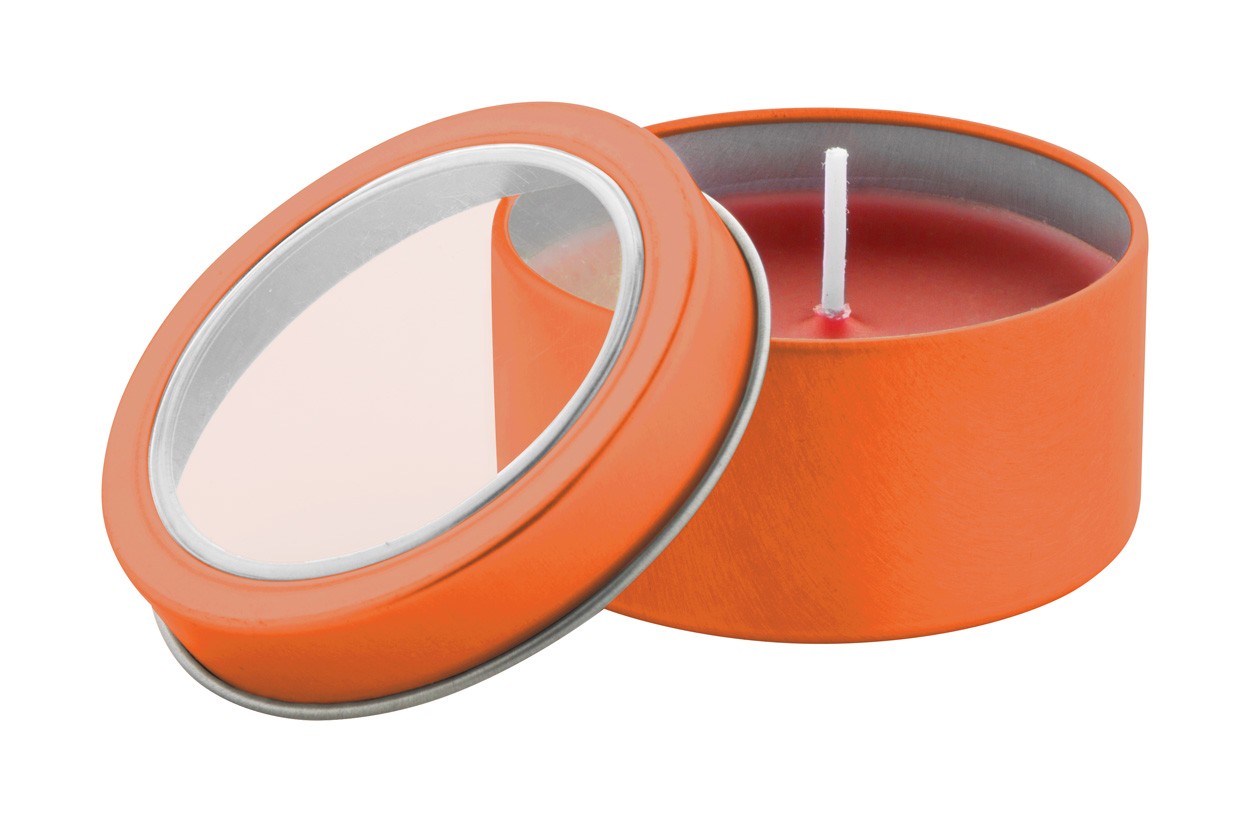 Lumânare parfumată cu aromă de vanilie, în cutie metalică cu capac.