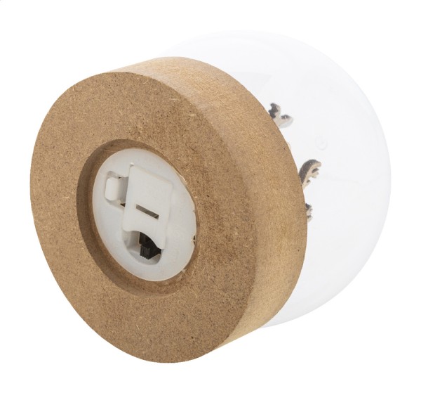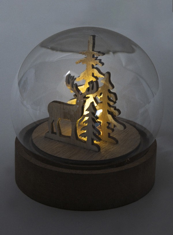 Decorațiune de Crăciun iluminată, în formă de glob de zăpadă, pe bază din lemn MDF cu lumină LED. Include baterii tip pastilă. Cu buton ON/OFF pe bază.