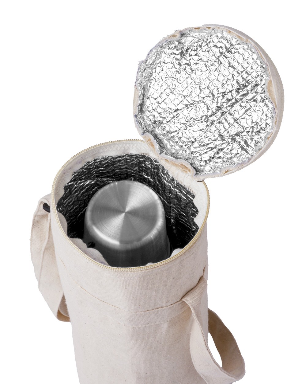 Geantă frigorifică pentru sticle, din bumbac reciclat, cu căptușeală din aluminiu și curea de umăr.