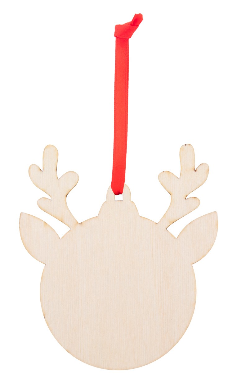 Ornament de brad, din lemn din placaj de mesteacăn, cu design de Crăciun imprimat și panglică rosie. Livrat cu panglică detașată.