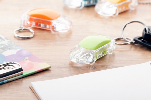 Breloc din plastic in formă de maşină, cu LED alb şi inel din metal. Baterii incluse.