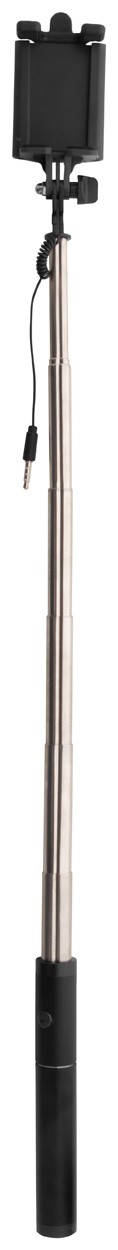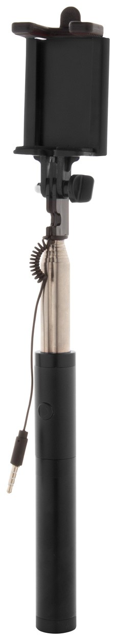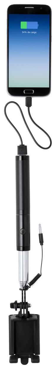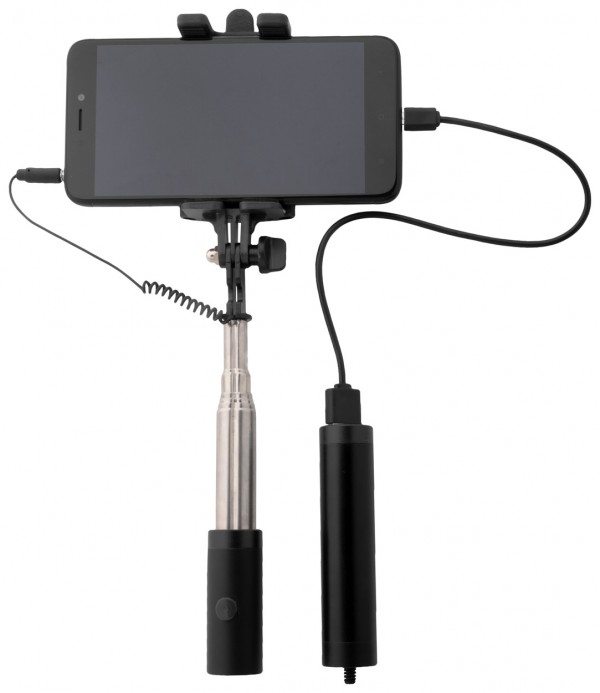 Selfie stick din aluminiu cu buton de declanșare (conectare prin mufa jack de 3,5mm) și suport universal pentru telefon mobil. Cu power bank detașabil la mâner, 2200 mAh. Cablu încărcător USB inclus.