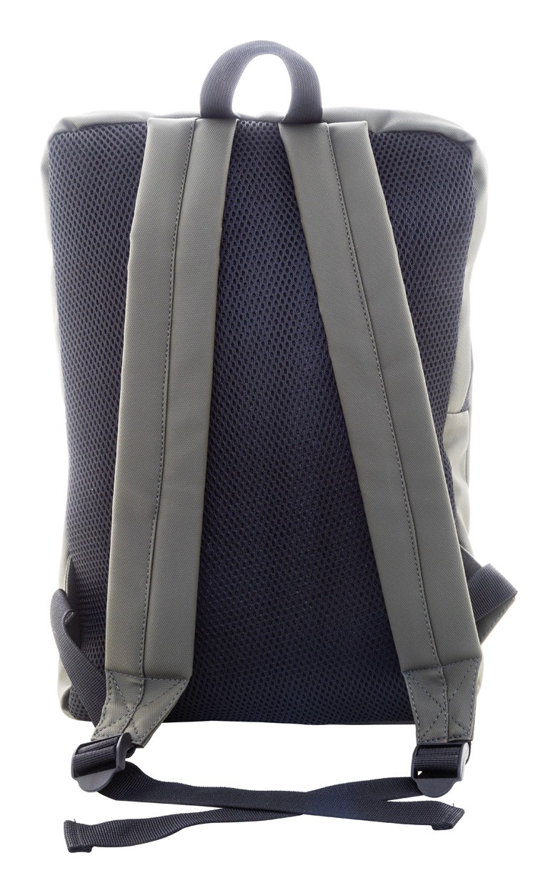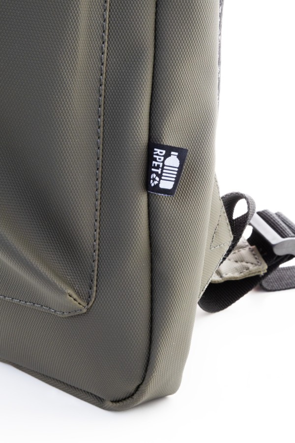 Rucsac pentru laptop slim, RPET impermeabil, cu compartiment pentru laptop cu fermoar (15") și buzunar frontal cu fermoar. Cu spate și bretele căptușite. Poliester 600D RPET acoperit cu PU, cu etichetă RPET distinctă.