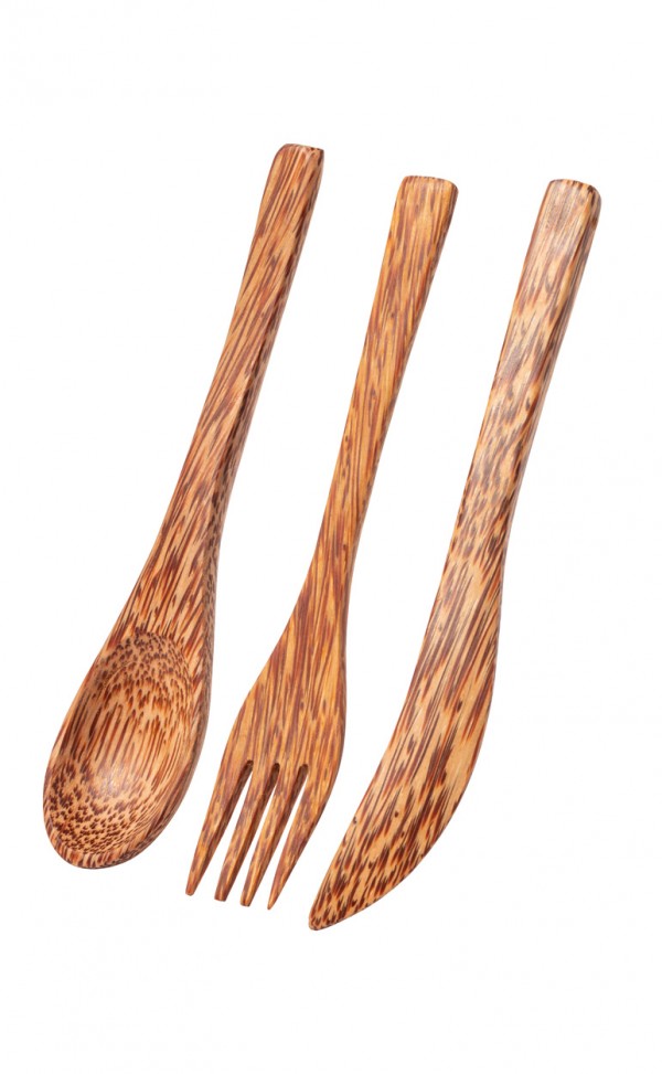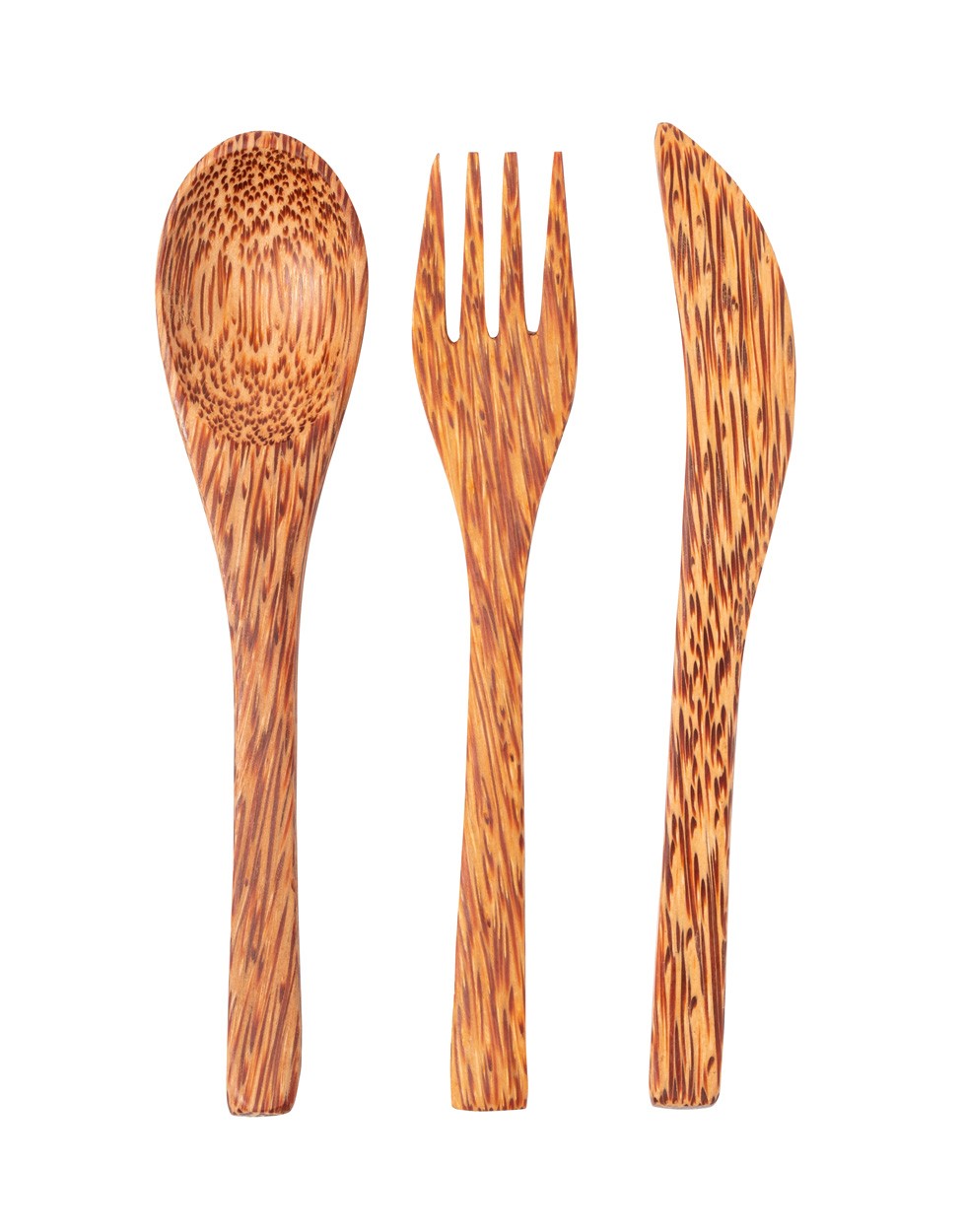 Set de tacâmuri din nucă de cocos 3 buc (linguriță, furculiță și cuțit) în pungă de bumbac.