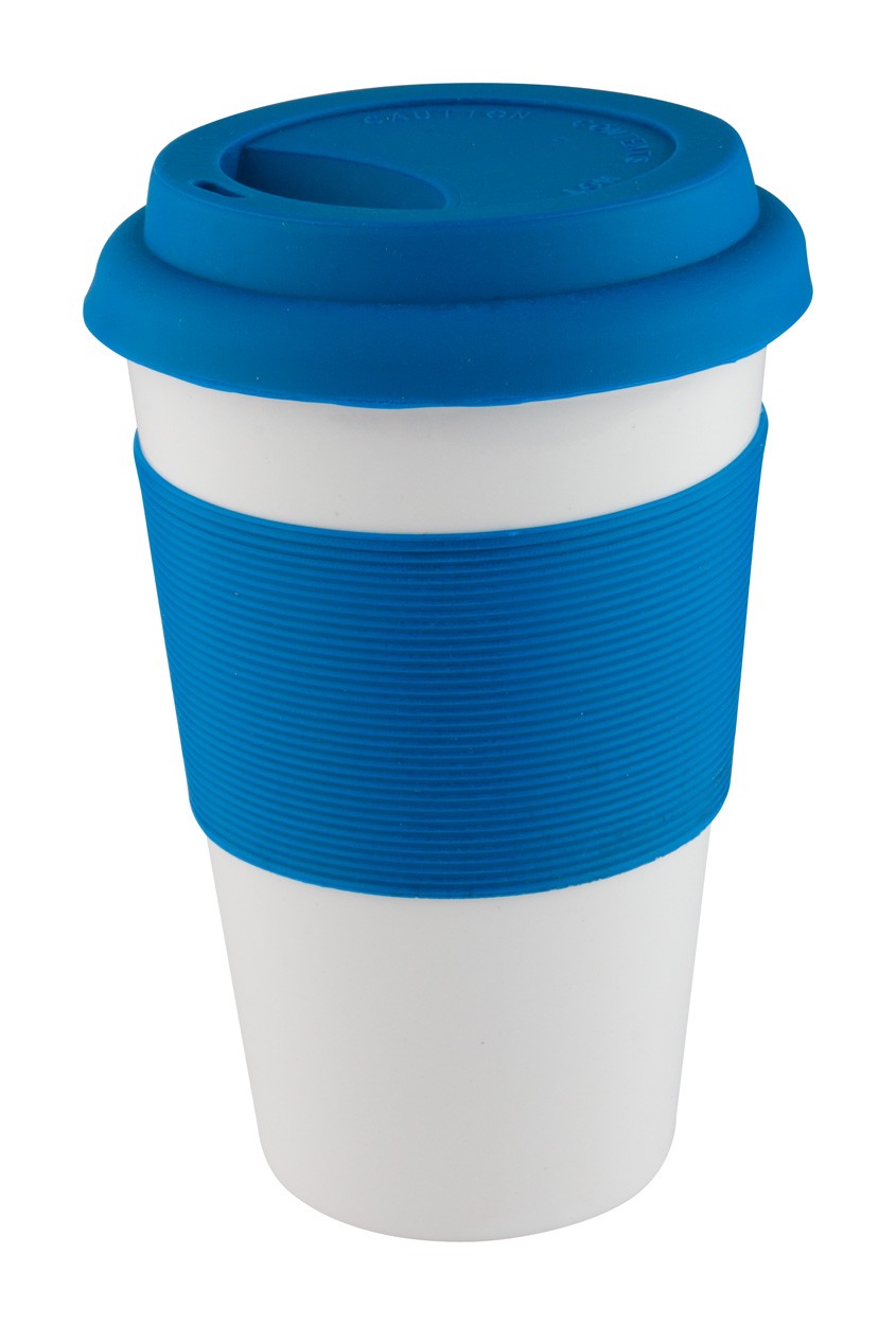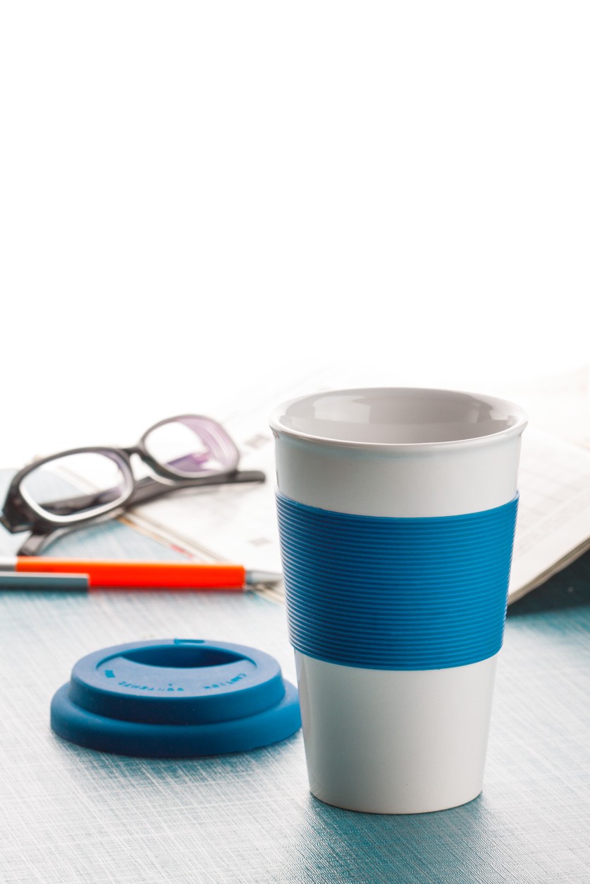 Cană ceramică cu dispozitiv de prindere şi capac din silicon, 400 ml.