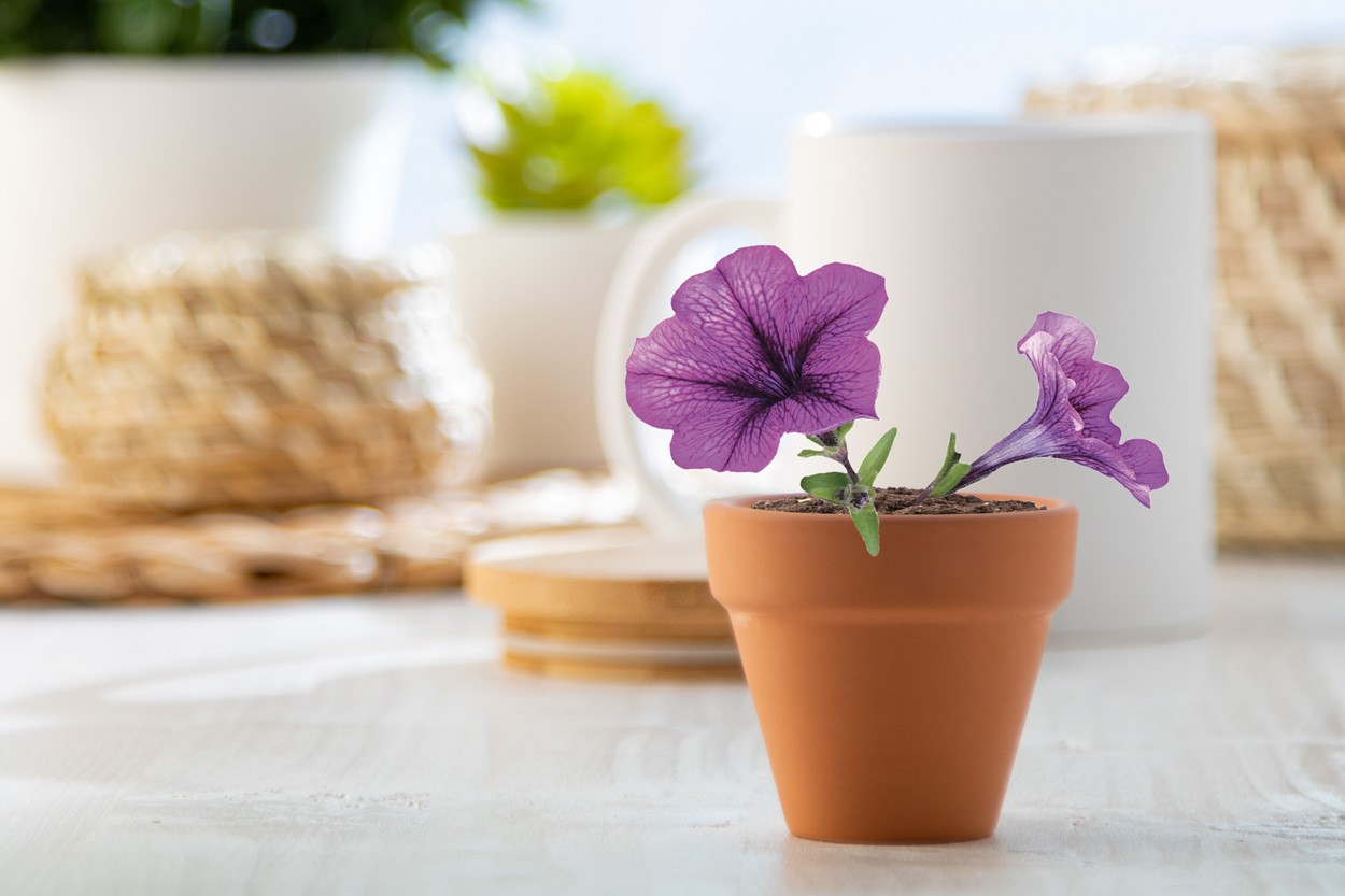 Ghiveci de flori, din teracotă, cu 5-8 buc de semințe de petunie în culori asortate.