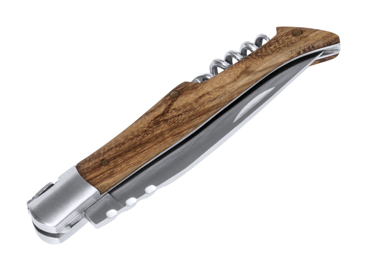 Stainless steel pocket knife with wooden handle and corkcew function.