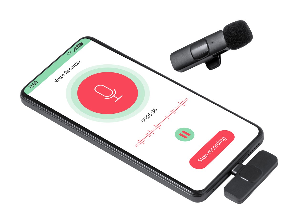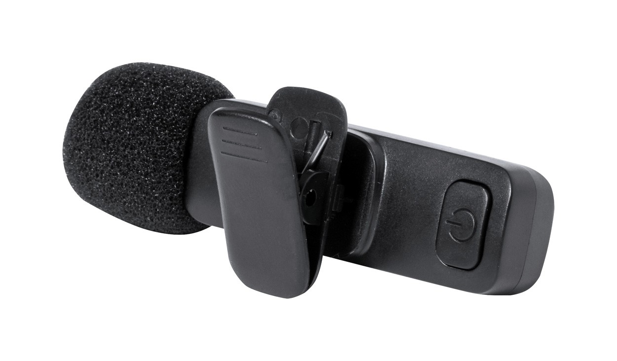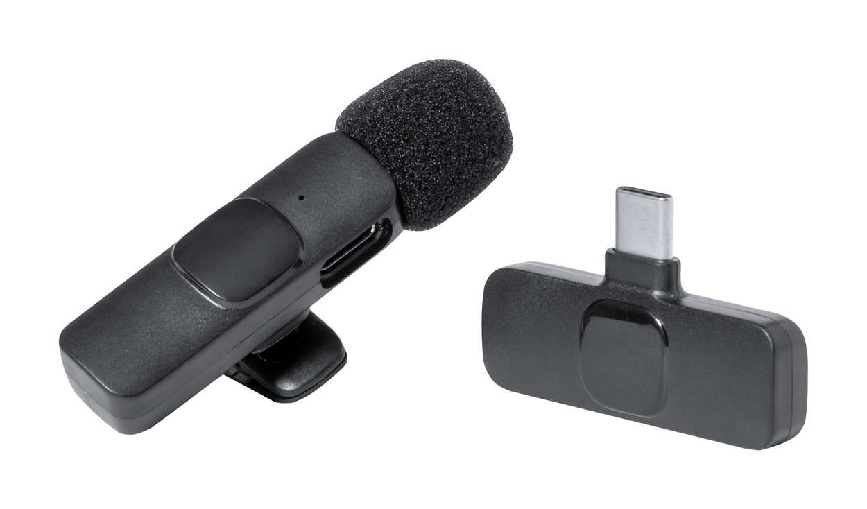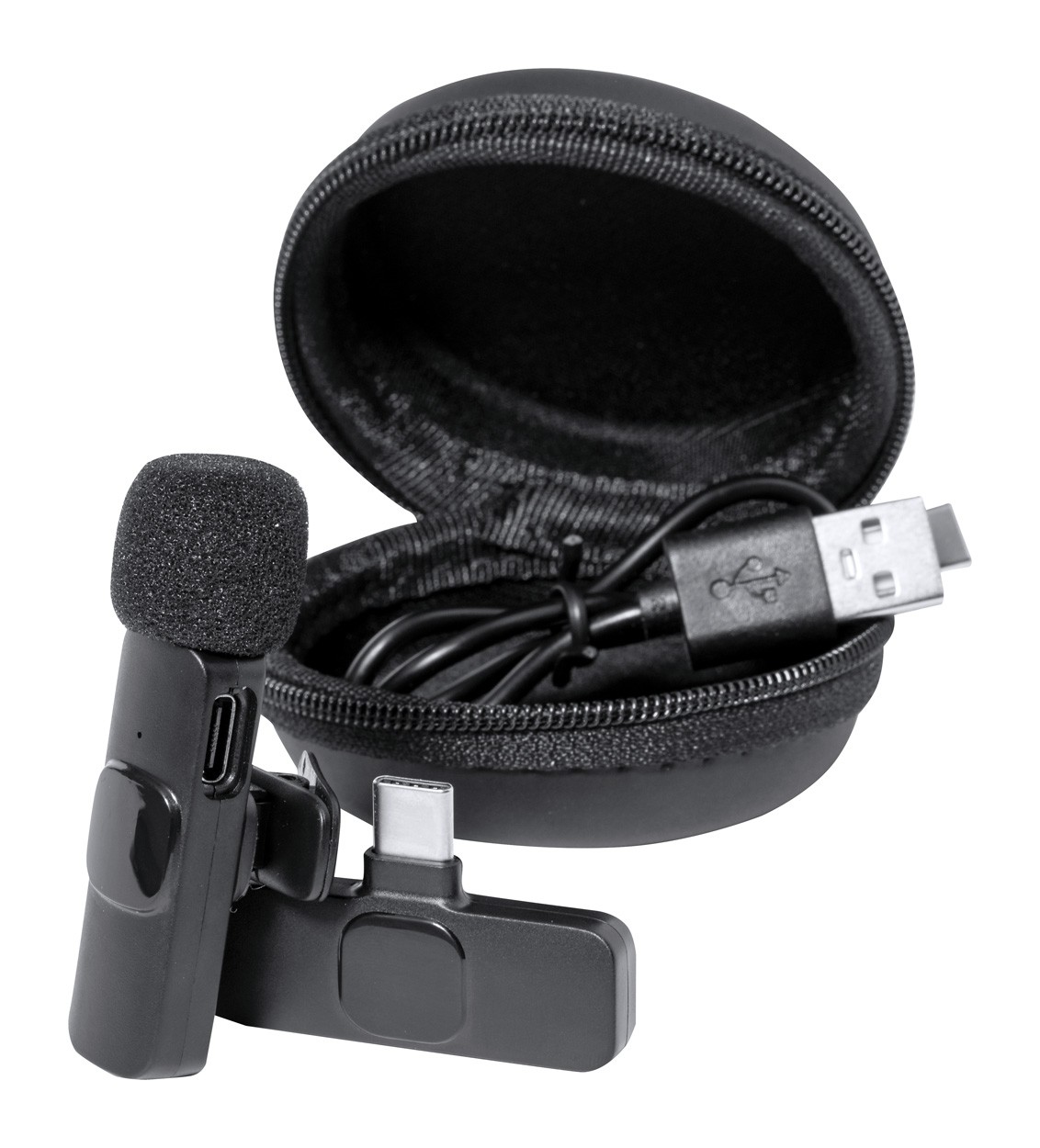 Microfon mobil wireless cu baterie reîncărcabilă încorporată (45 mAh) și receptor USB-C. În husă cu fermoar. Inclusiv cablu de încărcare USB.