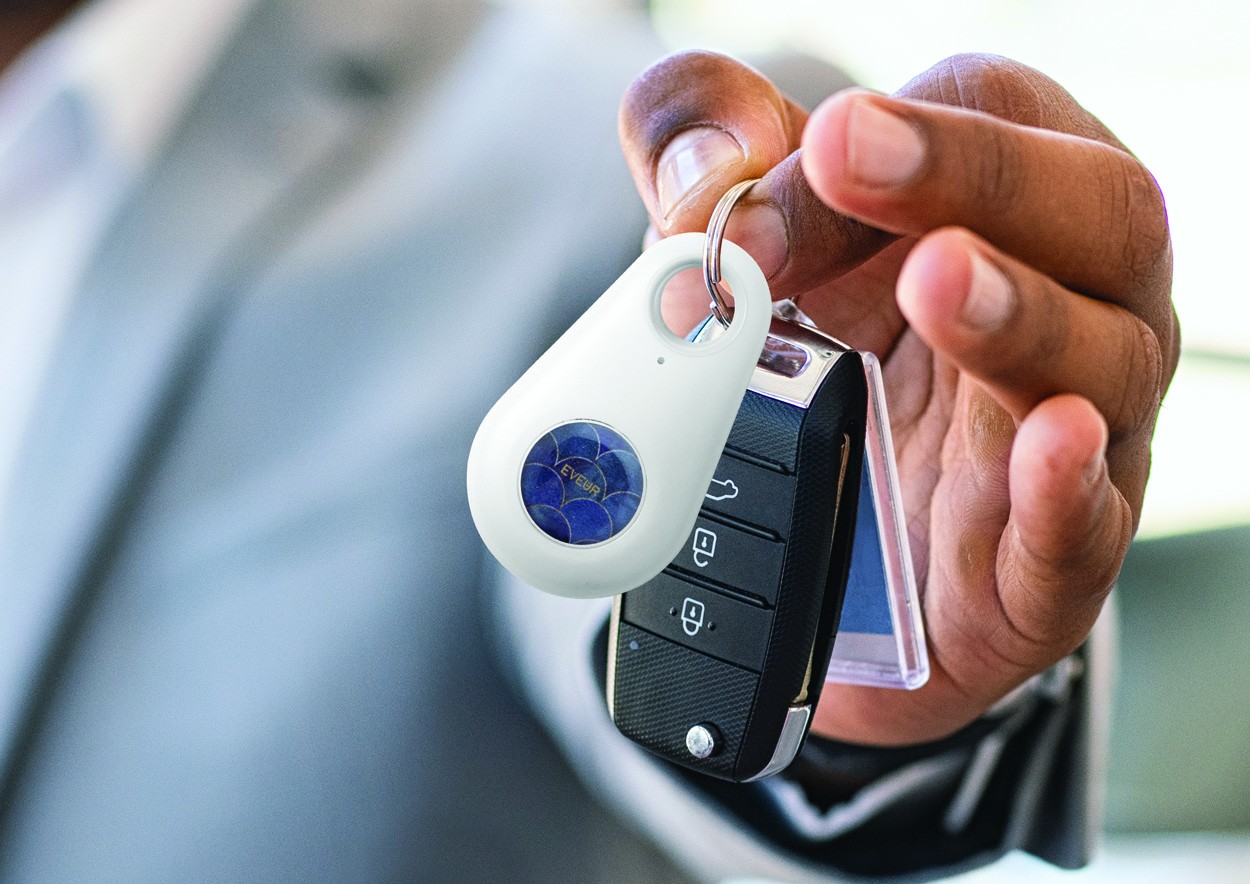 Dispozitiv anti-pierdere fără fir pentru găsirea cheilor, cu obturator de cameră, în carcasă de plastic. Cu baterie tip buton. Funcționează cu o aplicație gratuită iOS / Android.