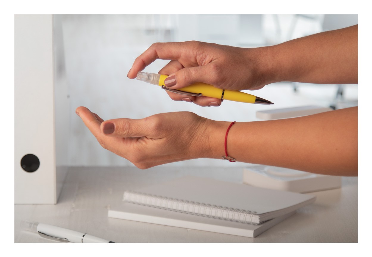 Pix din plastic, cu mina albastra si spray de 3 ml. Se livreaza fara dezinfectant.