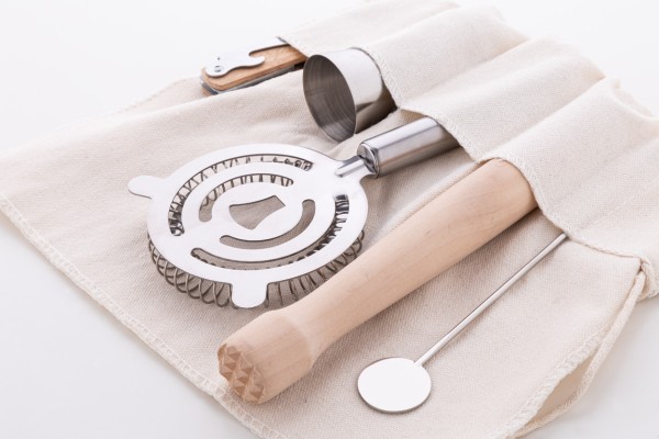 Set de cocktail, din 5 bucăți, în husă practică de bumbac.Include: jigger din oțel inoxidabil, strecurătoare și lingură de bar, tirbușon cu mâner din lemn și muddler din lemn.