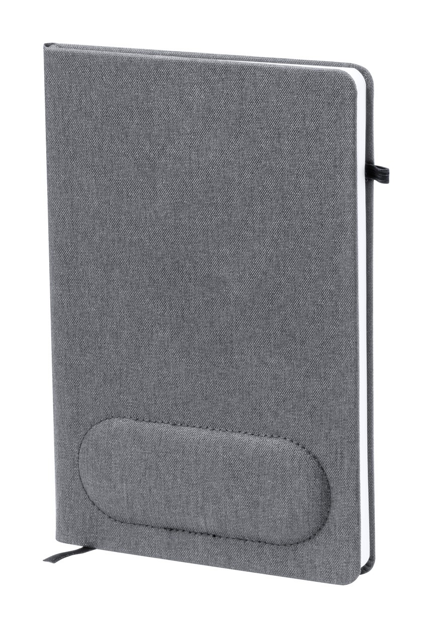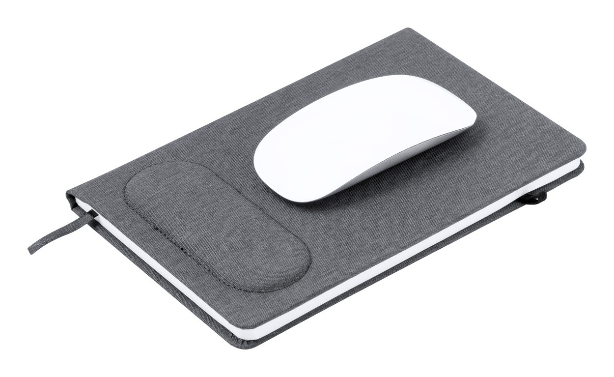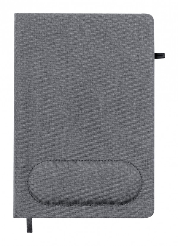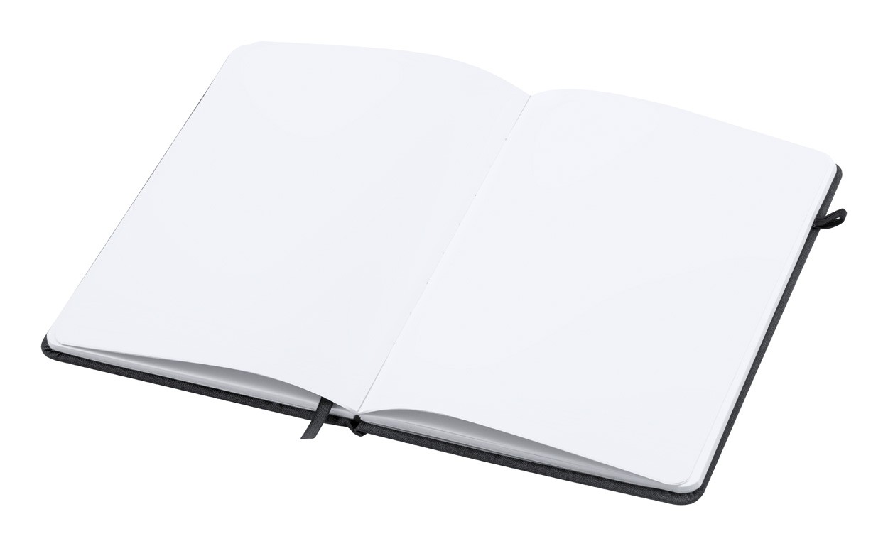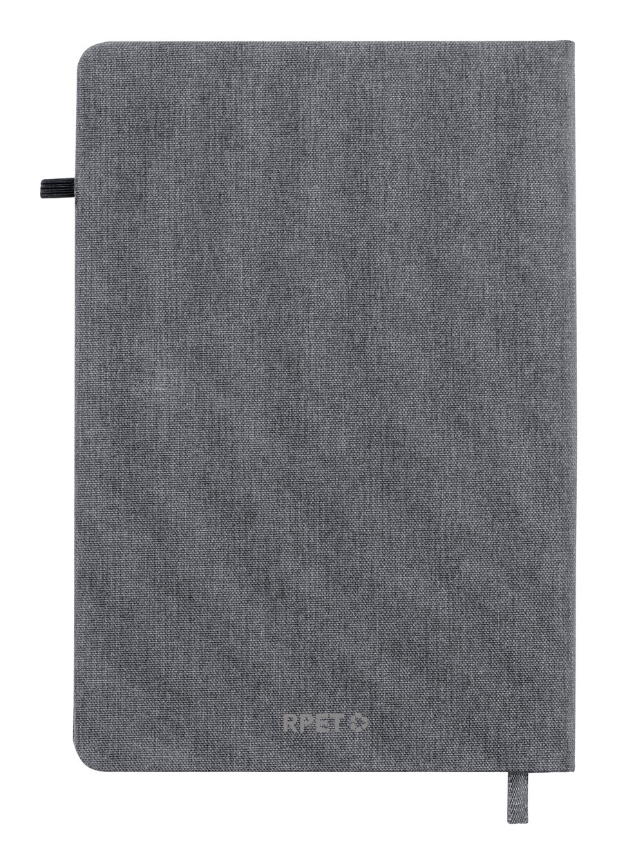 300D RPET polyester covered notebook with 100 blank sheets, bookmark, pen holder and mouse pad function.