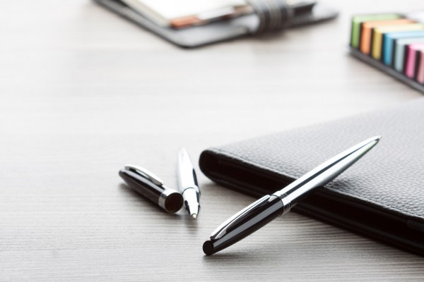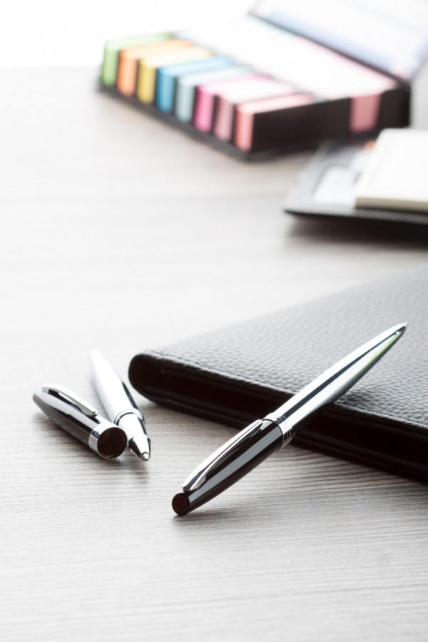 Pix şi roller metalic, capac negru lăcuit, corp şi clip cromat. În cutie de cadou, mină albastră.