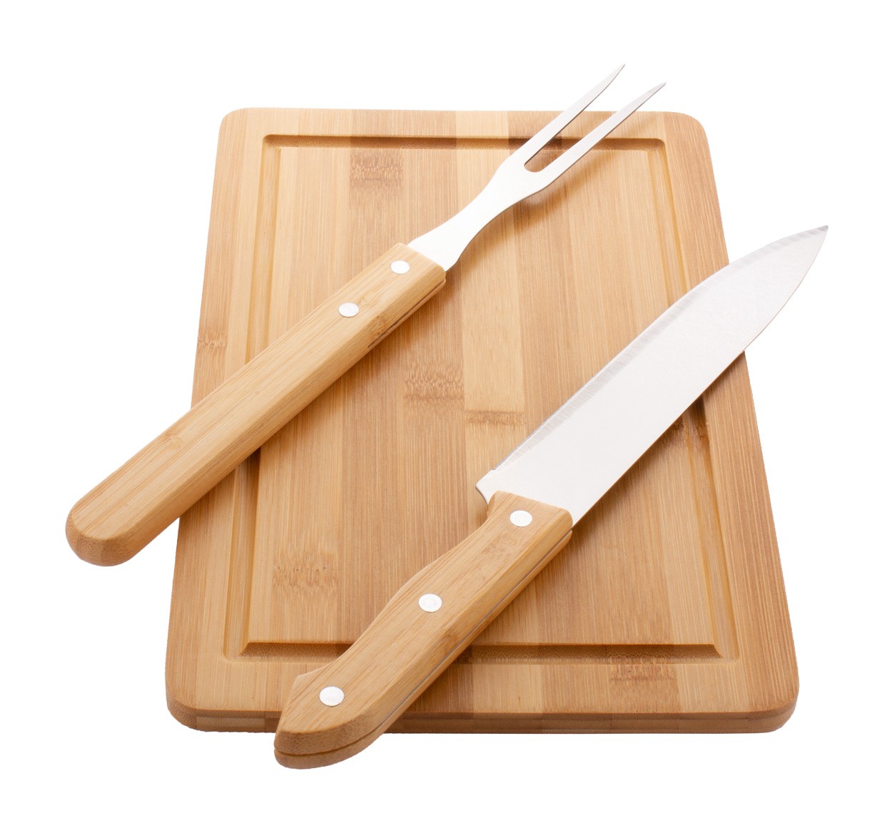 Set pentru tranșat carne, din bambus, cu tablă de tăiere din bambus, furculiță din oțel inoxidabil și cuțit cu mânere din bambus.