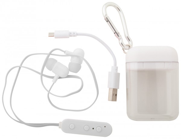Căsti cu bluetooth, cu baterie reîncărcabilă încorporată. În cutie transparentă, cu cablu încărcător USB.