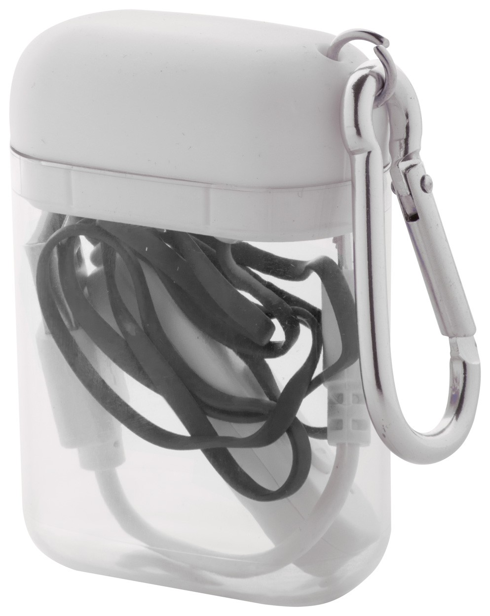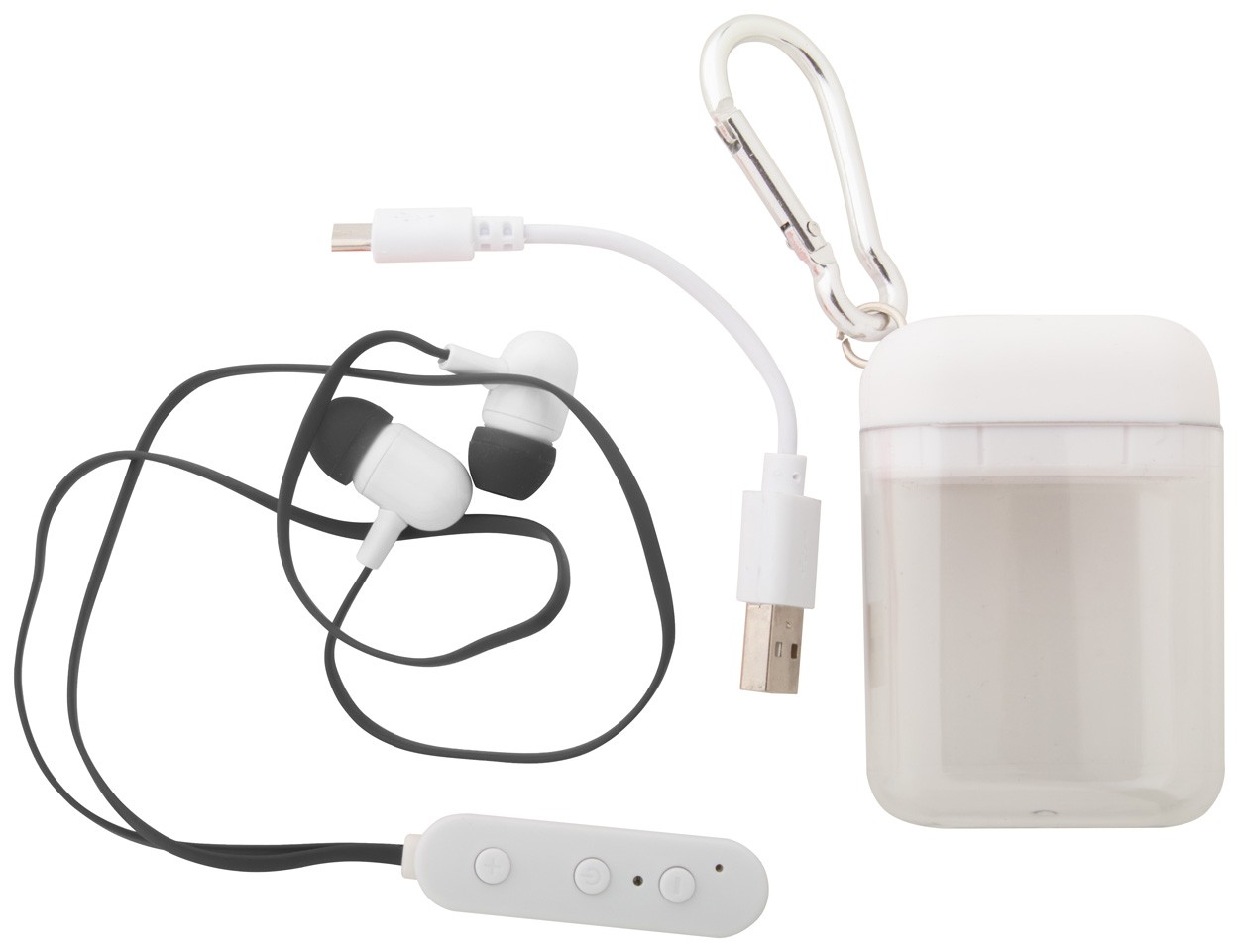 Căsti cu bluetooth, cu baterie reîncărcabilă încorporată. În cutie transparentă, cu cablu încărcător USB.