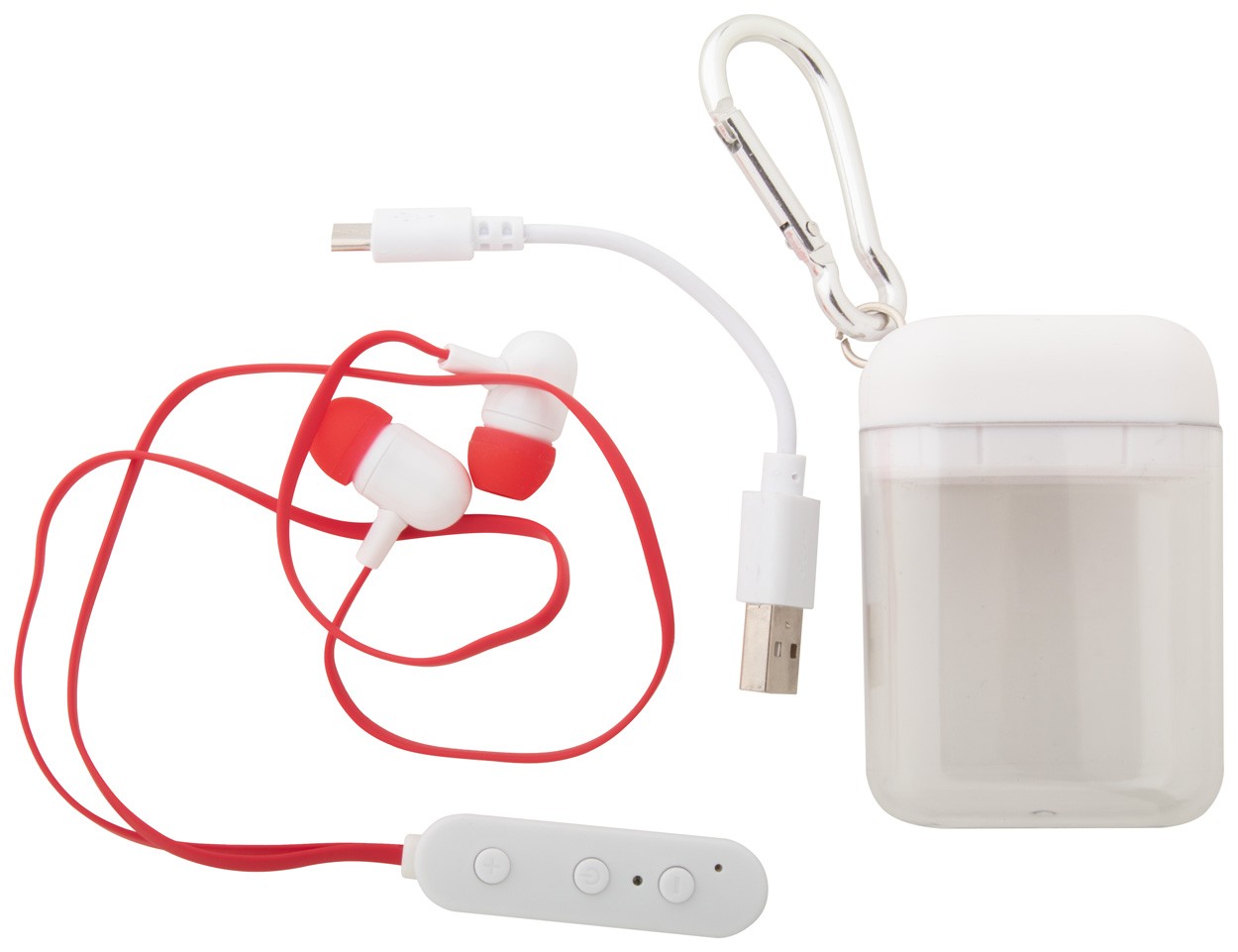 Căsti cu bluetooth, cu baterie reîncărcabilă încorporată. În cutie transparentă, cu cablu încărcător USB.