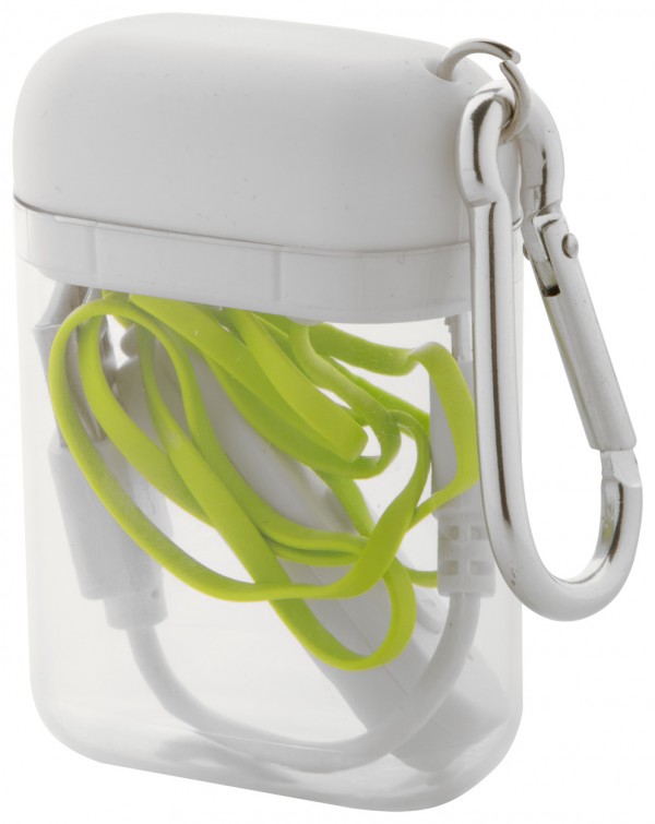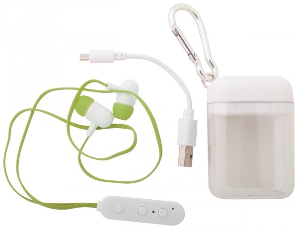 Căsti cu bluetooth, cu baterie reîncărcabilă încorporată. În cutie transparentă, cu cablu încărcător USB.