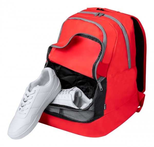 Rucsac RPET, cu buzunare principale și frontale cu fermoar, compartiment pentru pantofi, din plasă, mâner căptușit, bretele pentru spate și umăr. Poliester 600D RPET cu etichetă distinctivă RPET.
