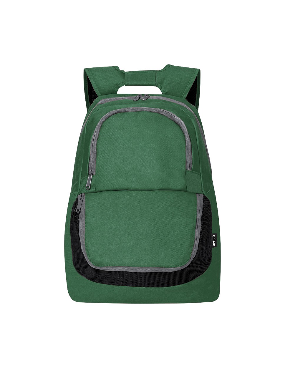 Rucsac RPET, cu buzunare principale și frontale cu fermoar, compartiment pentru pantofi, din plasă, mâner căptușit, bretele pentru spate și umăr. Poliester 600D RPET cu etichetă distinctivă RPET.