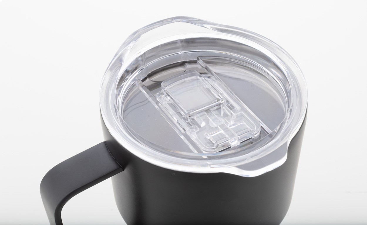 Cană termoizolată, din oțel inoxidabil reciclat, cu perete dublu, cu capac pentru băut din plastic ABS. 470 ml.