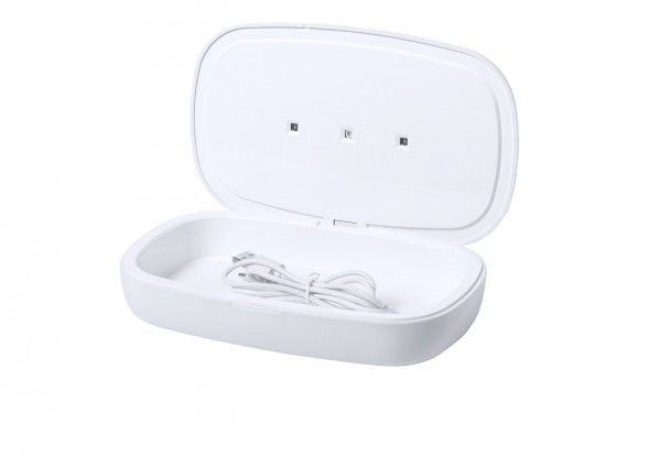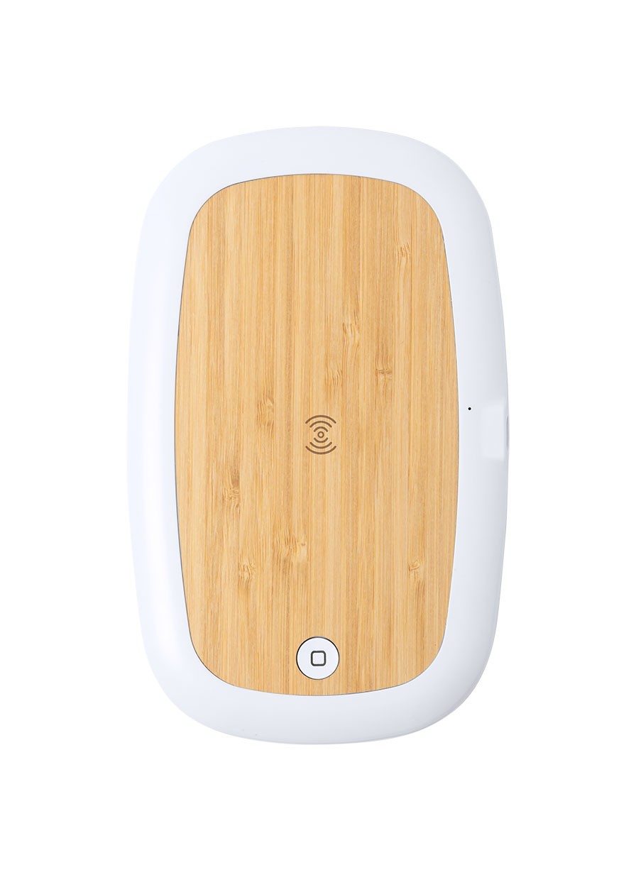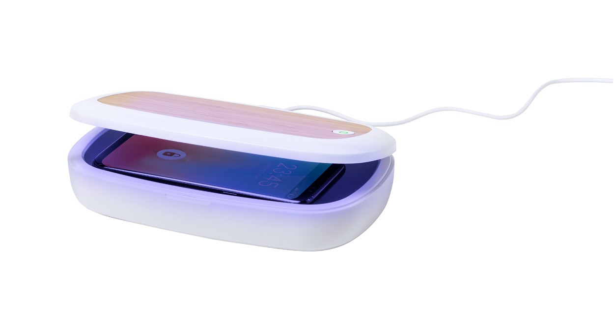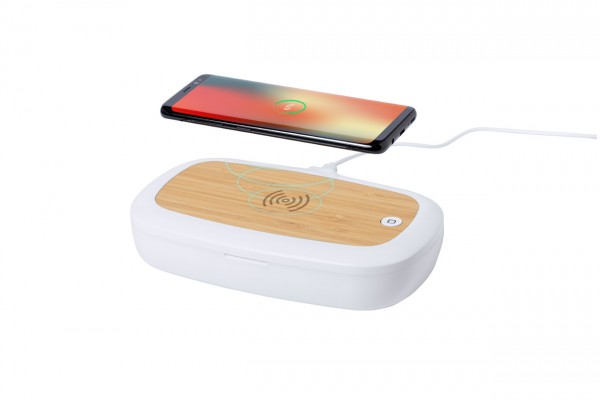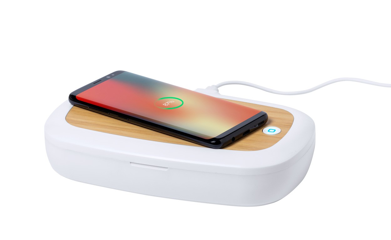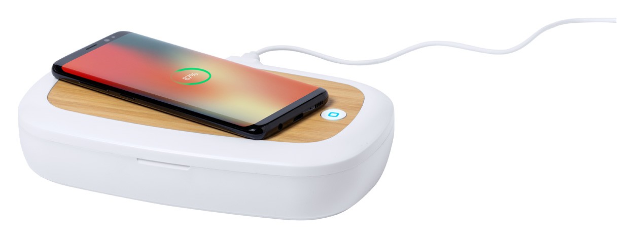 Cutie de sterilizare UV-C cu încărcător wireless acoperit cu bambus (5W). Ideal pentru sterilizarea smartphone-urilor, cheilor sau ochelarilor. Timp de sterilizare cu funcție de oprire automată de 5 și 10 minute. Inclusiv cablu de încărcare USB.