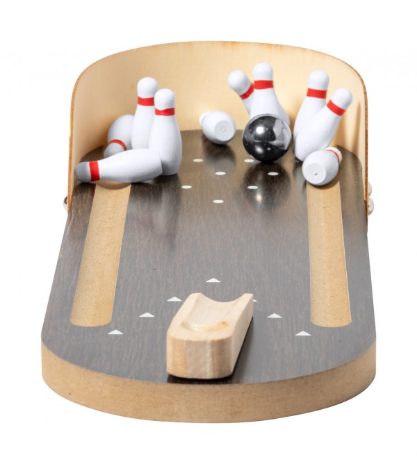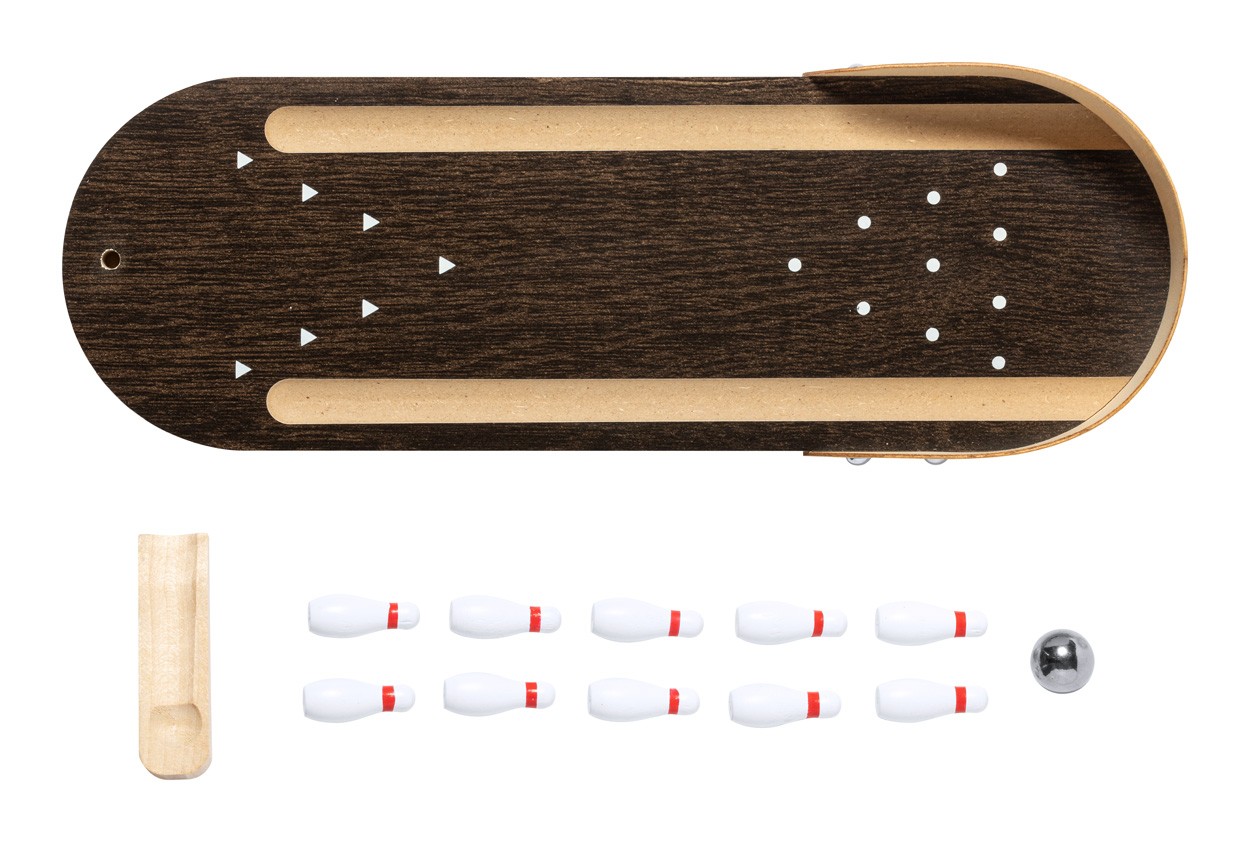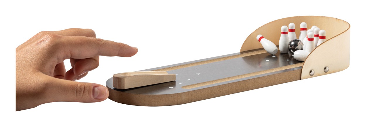 Set mini joc de bowling din lemn, care include 1 minge de bowling din metal, 10 pioni și o bază din lemn.