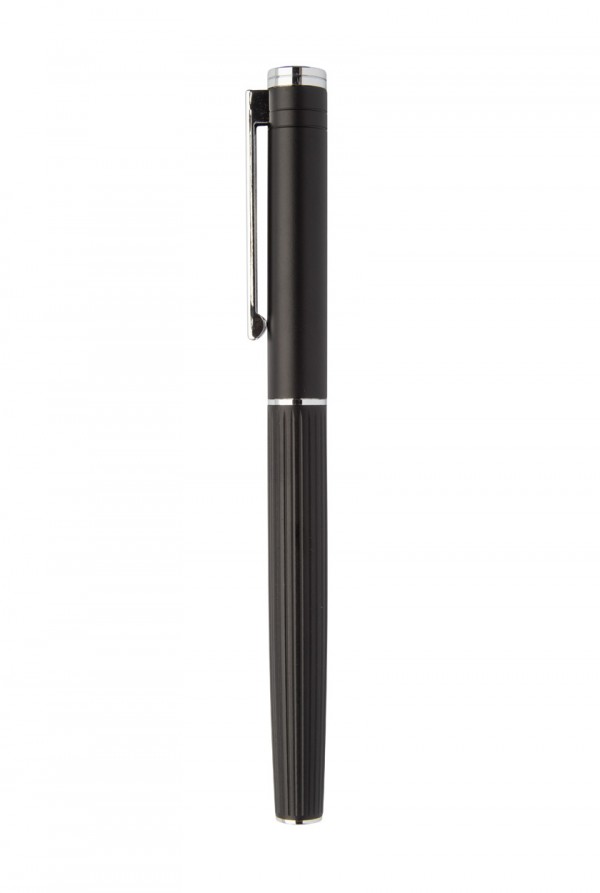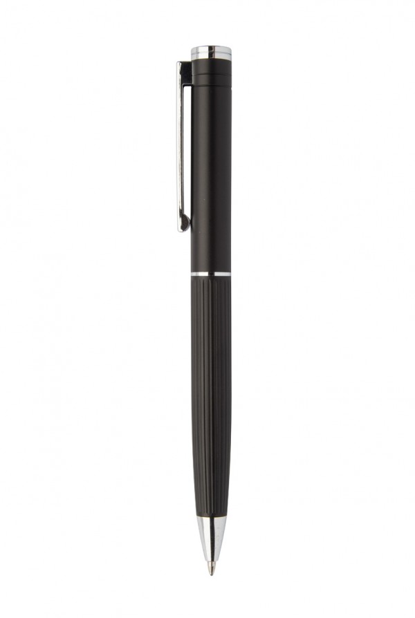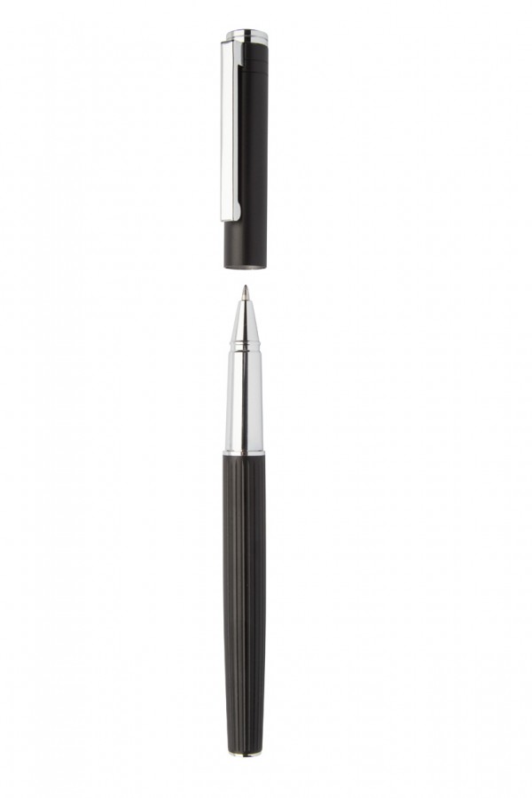 Set elegant de pix și pix roller din aluminiu, cu corp texturat în dungi. În cutie cadou neagră, cu mină albastră.