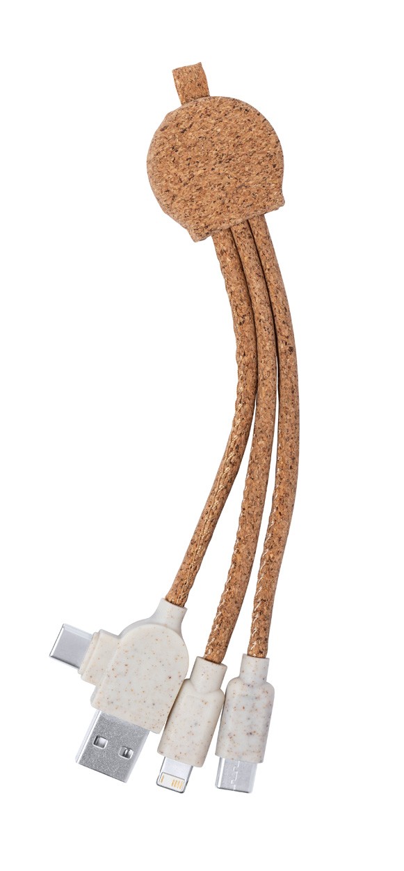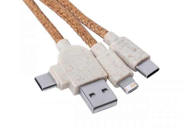 Cablu încărcător USB din plastic natural din plută și paie de grâu cu conectori micro USB, USB-C (intrare și ieșire) și fulger.