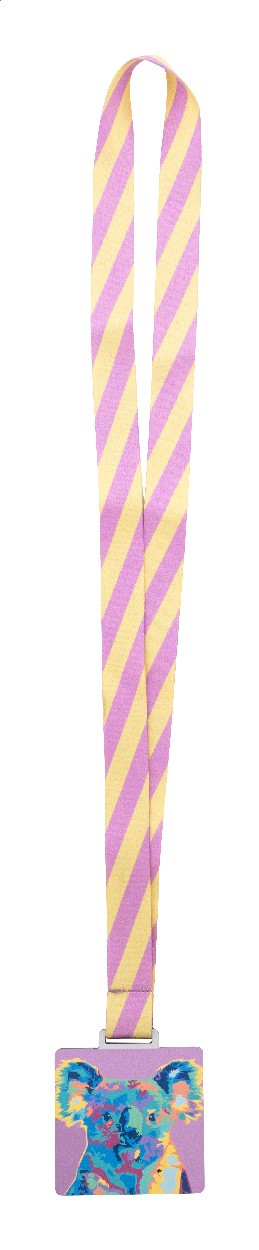 Medalie personalizată, de formă pătrată, din aluminiu compozit periat, cu grafică color. Șnur din RPET imprimat prin sublimare. Prețul include sublimarea și imprimarea UV LED. MOQ: 100 buc.