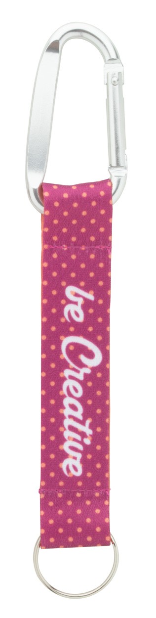 Breloc din poliester RPET personalizat, cu grafică imprimată prin sublimare pe ambele părți. Cu etichetă interioară RPET, carabină din aluminiu reciclat și inel metalic. MOQ: 100 buc.