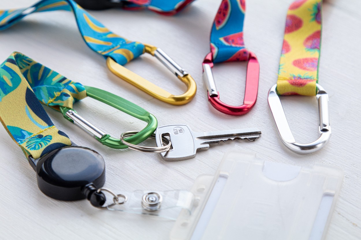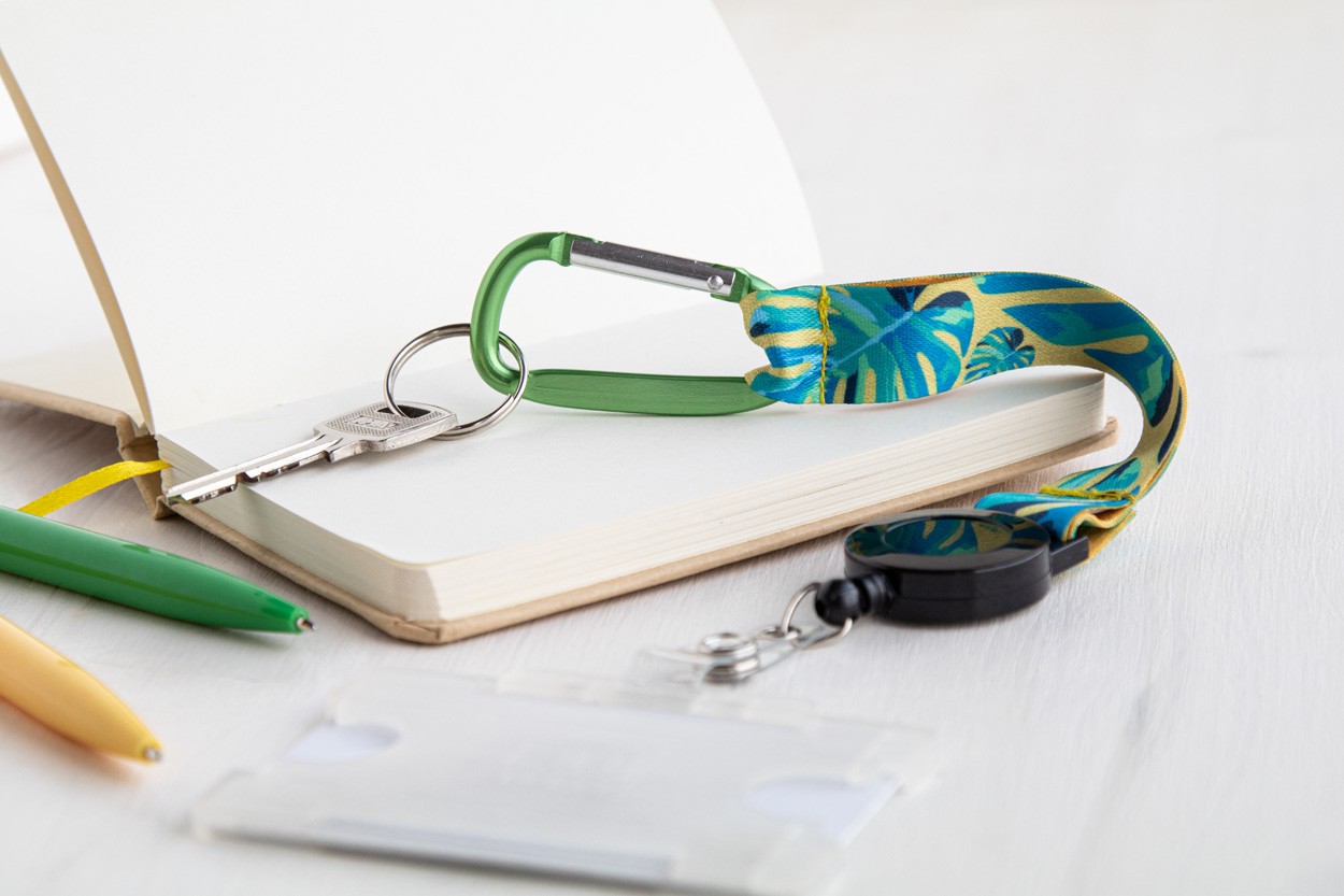 Breloc personalizat, din poliester, cu grafică imprimată prin sublimare pe ambele părți. Cu suport telescopic, carabină din aluminiu și breloc metalic. MOQ: 100 buc.