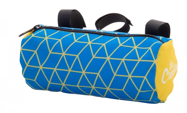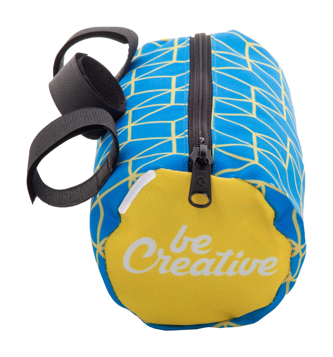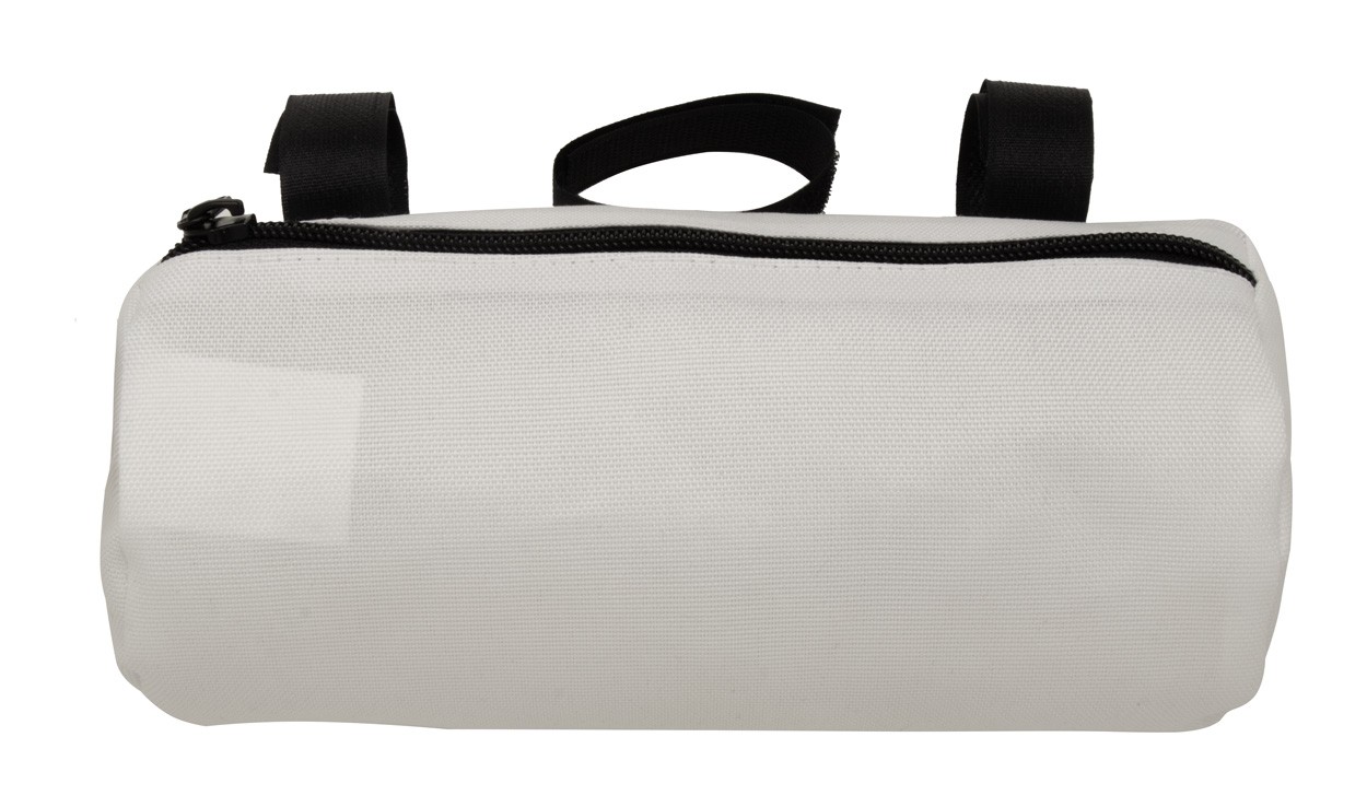 Geantă pentru ghidon de bicicletă, realizată la comandă, cu fermoar, din poliester 600D RPET, cu curele velcro reglabile. Cu grafică imprimată prin sublimare integrală ?i etichetă distinctivă RPET. MOQ: 25 buc.